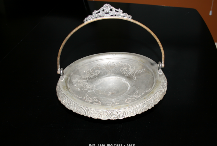 This is a vintage pewter or silver tray/dish or mini-basket with handle of EG Webster & Son.