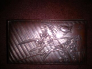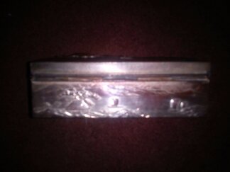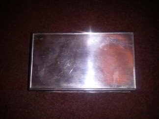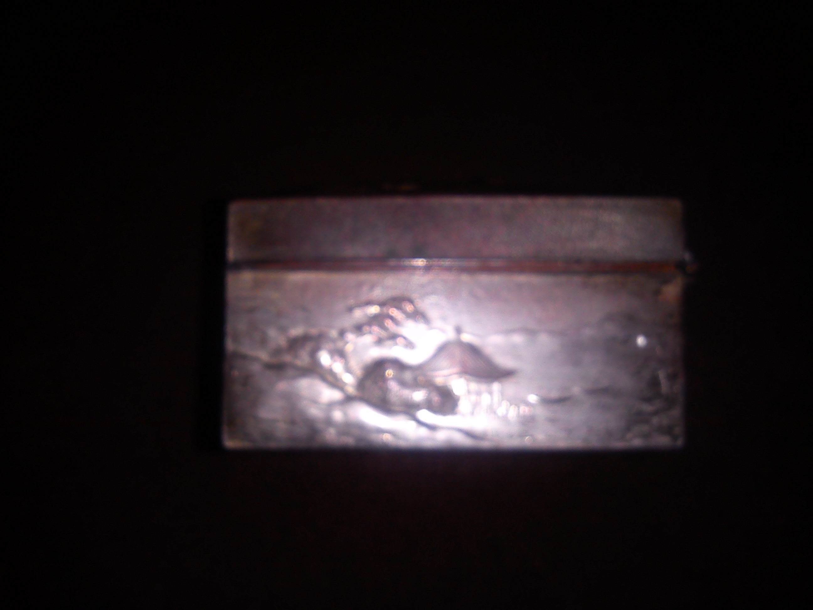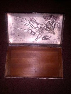 Silver Plate with wood inside and has a hinged lid, i think the silver plate is on copper, lovely embossed decoration on and around the box, i think it is chinese theme very eye catching.