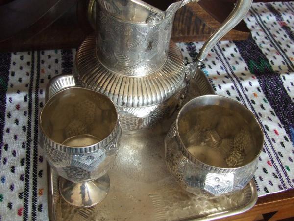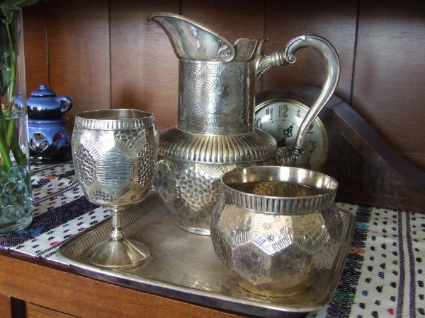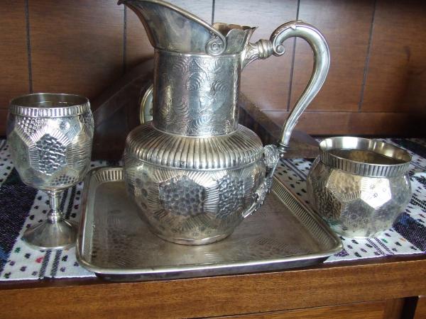 Silver plate water service set consisting of a pitcher (9"), a goblet (5"), a bowl and a square tray (10"). I believe made around 1885 by Derby Silver Co. See picture.