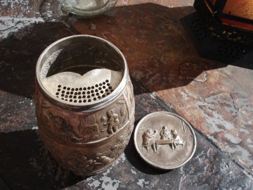 A rare cocktail shaker in the form of a carved whiskey barrel. It has nine scenes which depicts