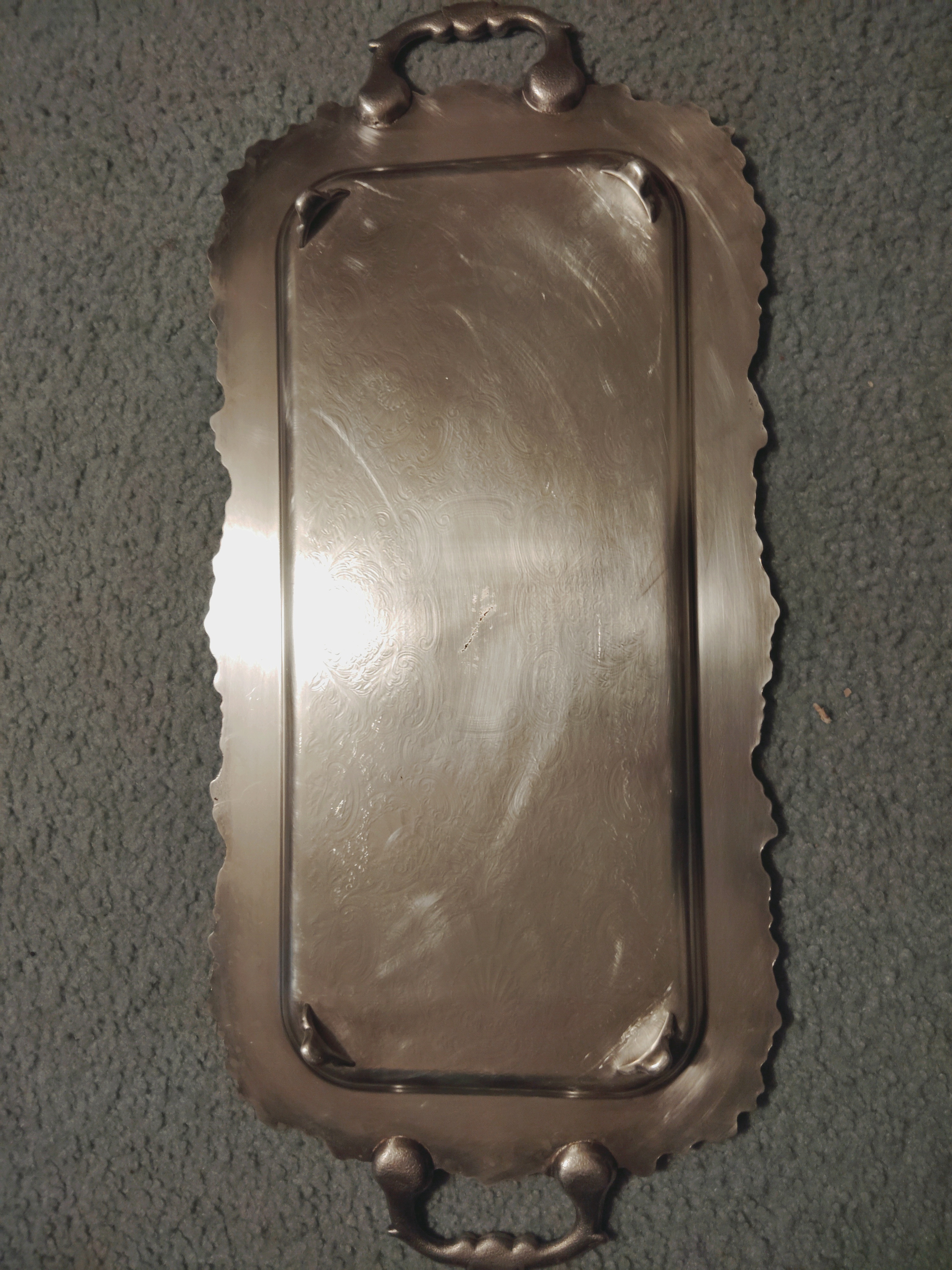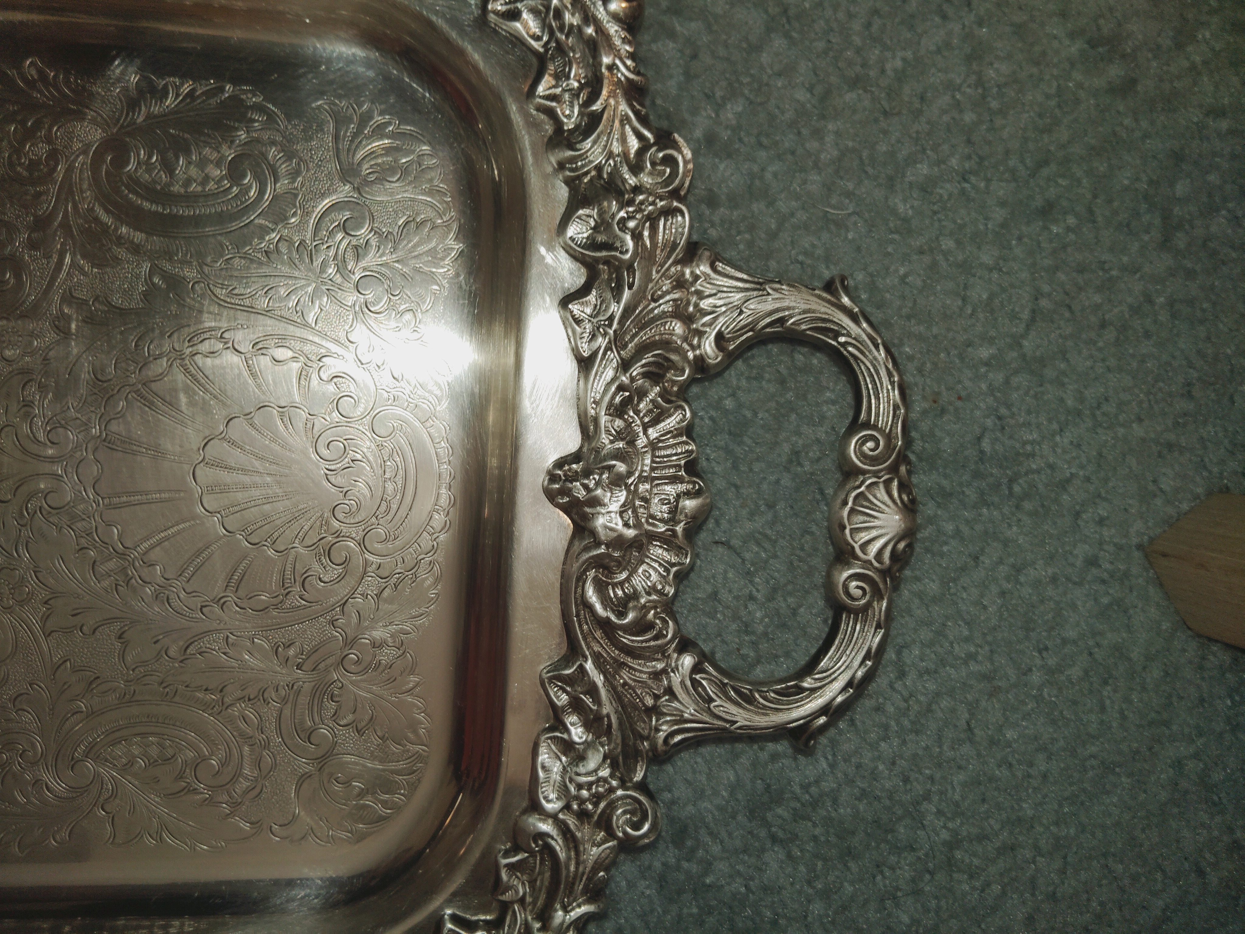 Physical Description: This is a rectangular silver-plated tray featuring ornate handles and intricate floral engravings across its surface. The tray exhibits a heavy construction, indicative of quality craftsmanship. The dimensions are not provided, but the tray appears to be of substantial size, suitable for serving or display.