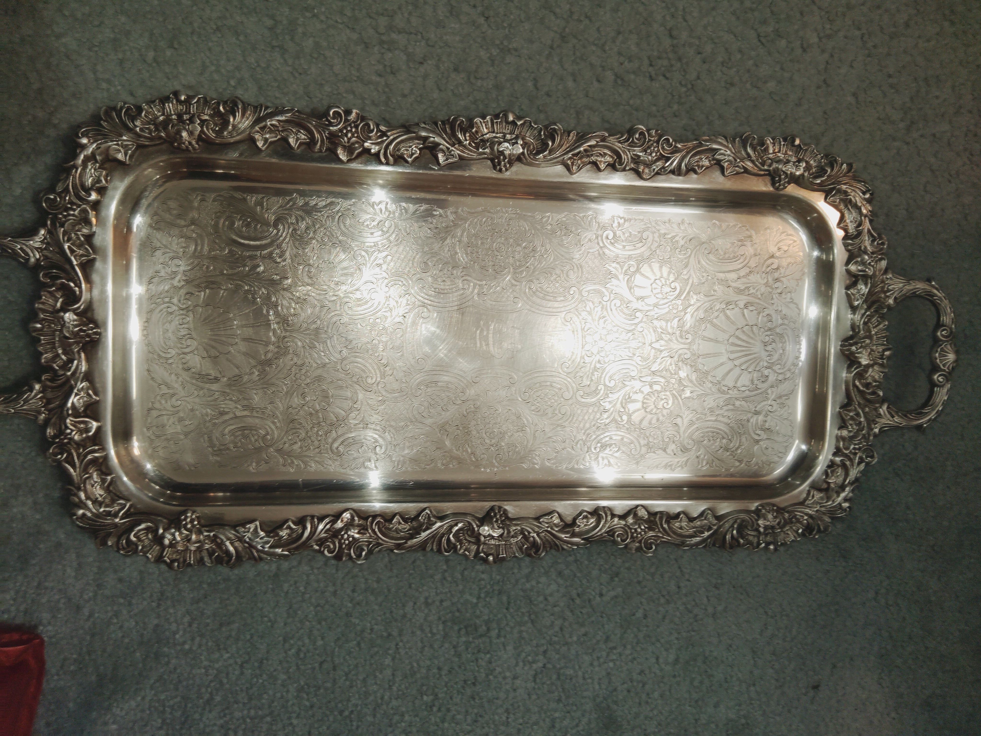 Physical Description: This vintage silver plated rectangular tray features ornate pierced designs along the edges and two decorative handles. The tray is weighted, indicating a substantial build quality. The surface is engraved with intricate floral and scroll patterns, showcasing craftsmanship typical of mid-20th century silverware.