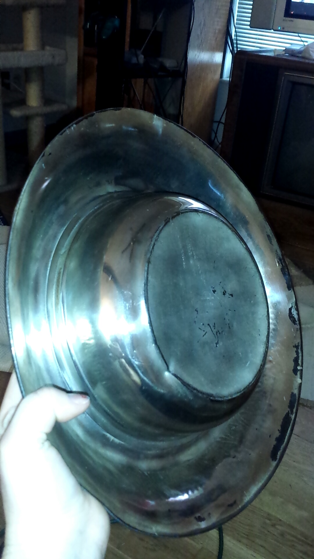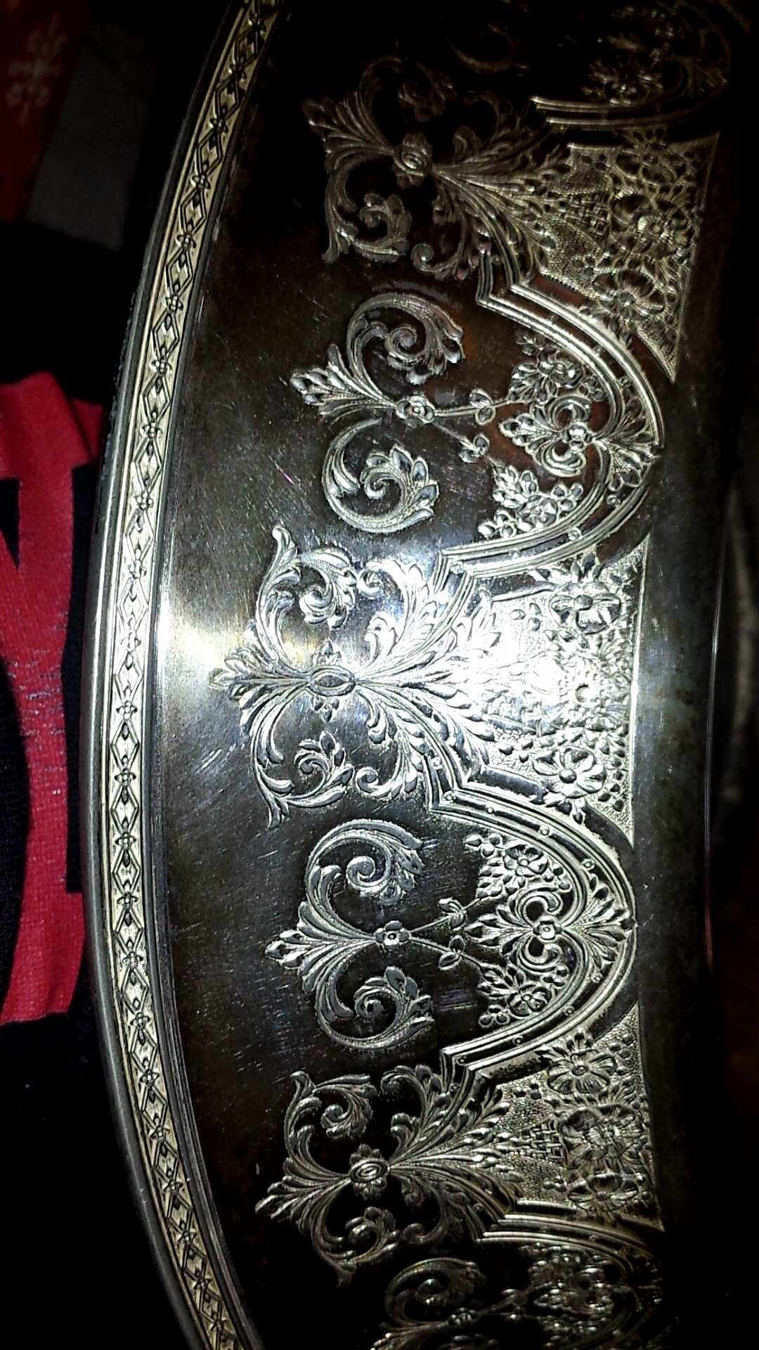 Discoloration on the bottom of the bowl. Intricate designs on the border/ rims of the bowl