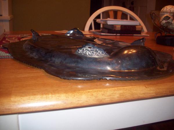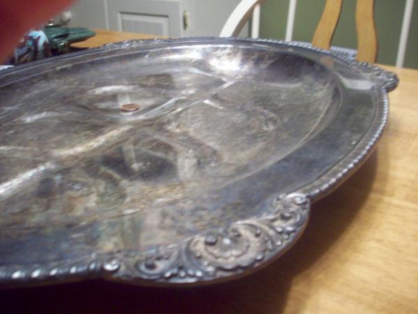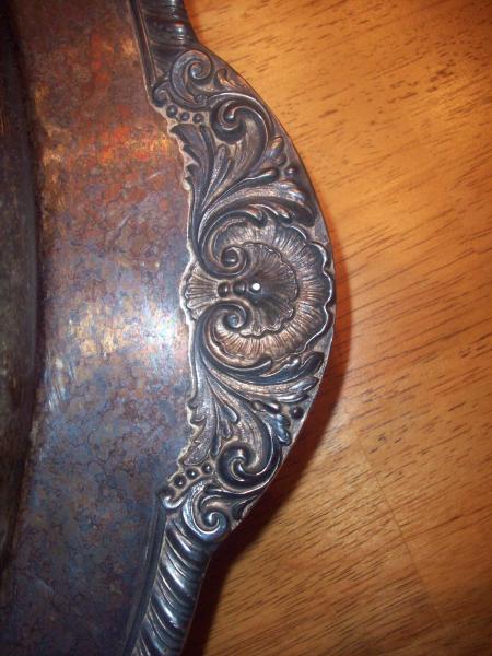 The mark on the bottom of the plate reads: "Silver on Copper" and on either side of this are two crowns stamped into it. I read somewhere that F.B. Rogers has a one-crown logo with 18 and 83 on opposite sides, but on this there are two crowns and no date. I searched other collections and patterns of the International Silver Co., but I did not see anything that looked identical. Also, I looked at Reed & Barton's turkey platters but the tops of their trees were not the same.