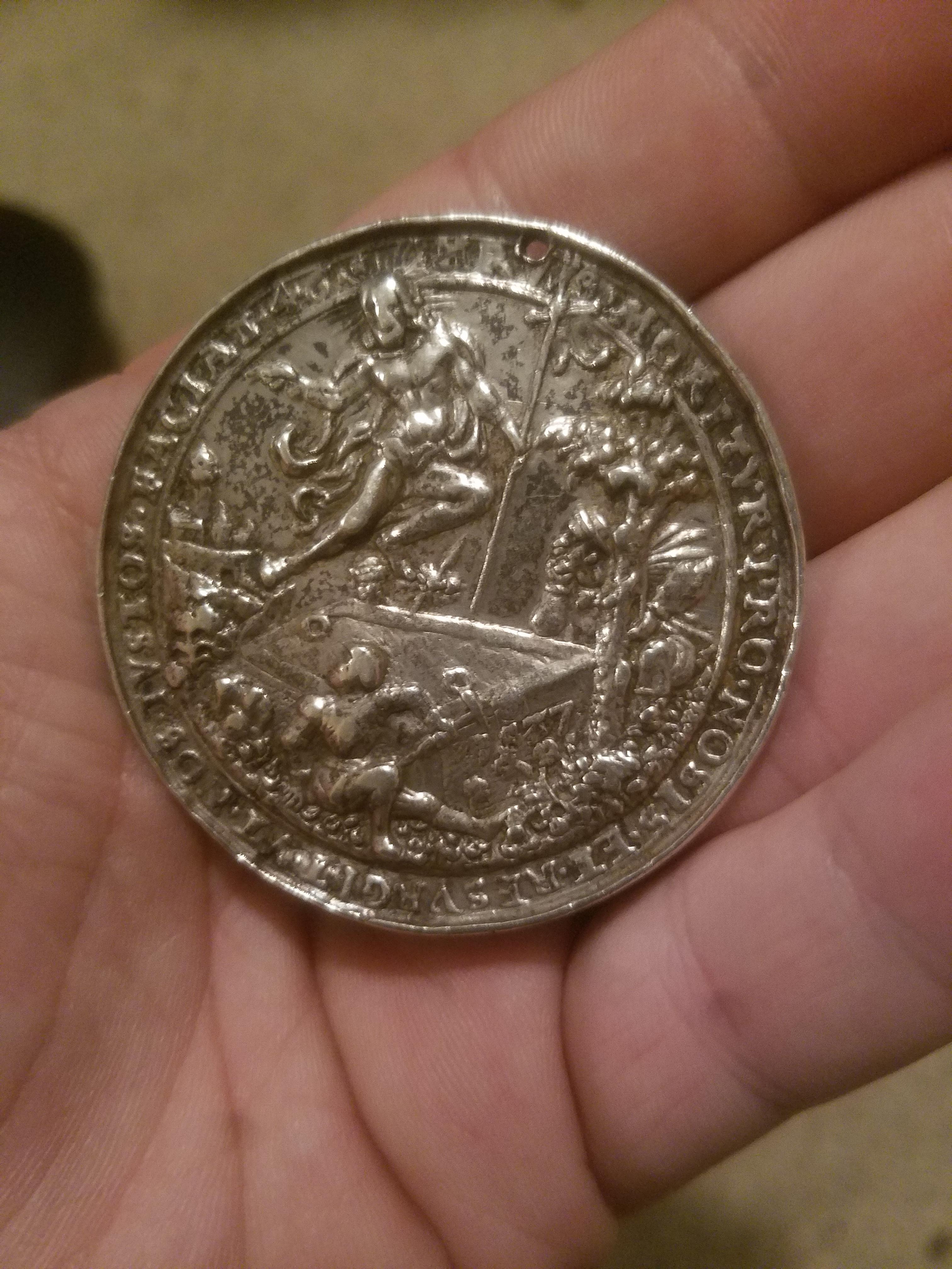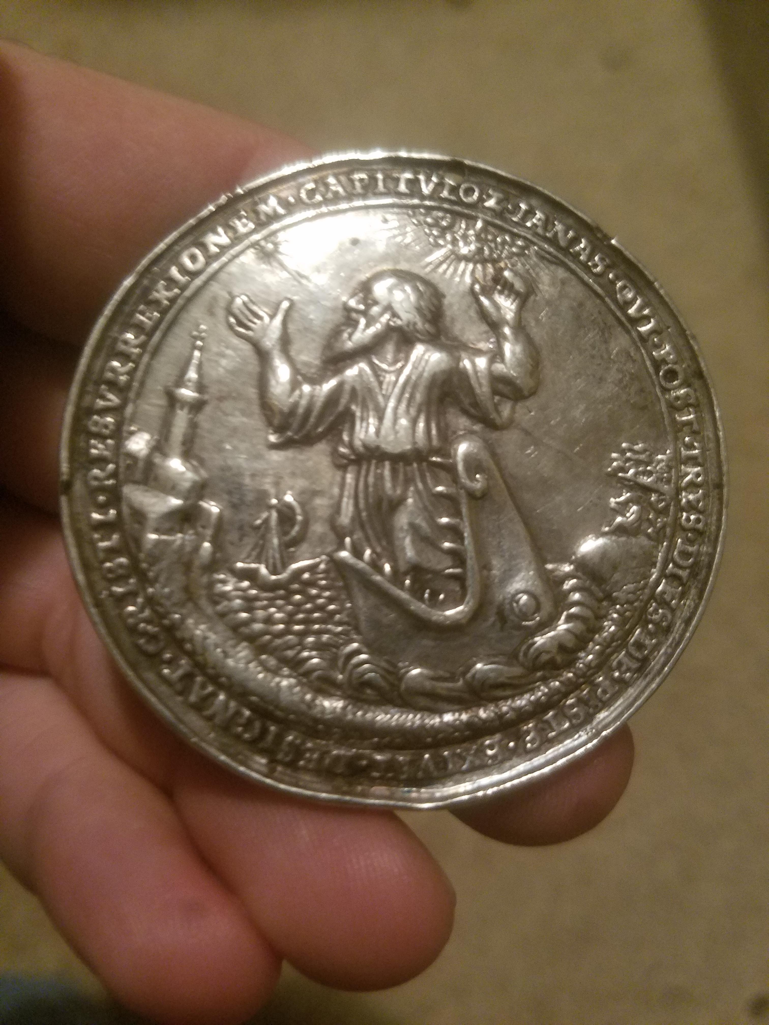 Depicts jonah and whale one side and some sort of battle the other its silver with latin writting