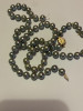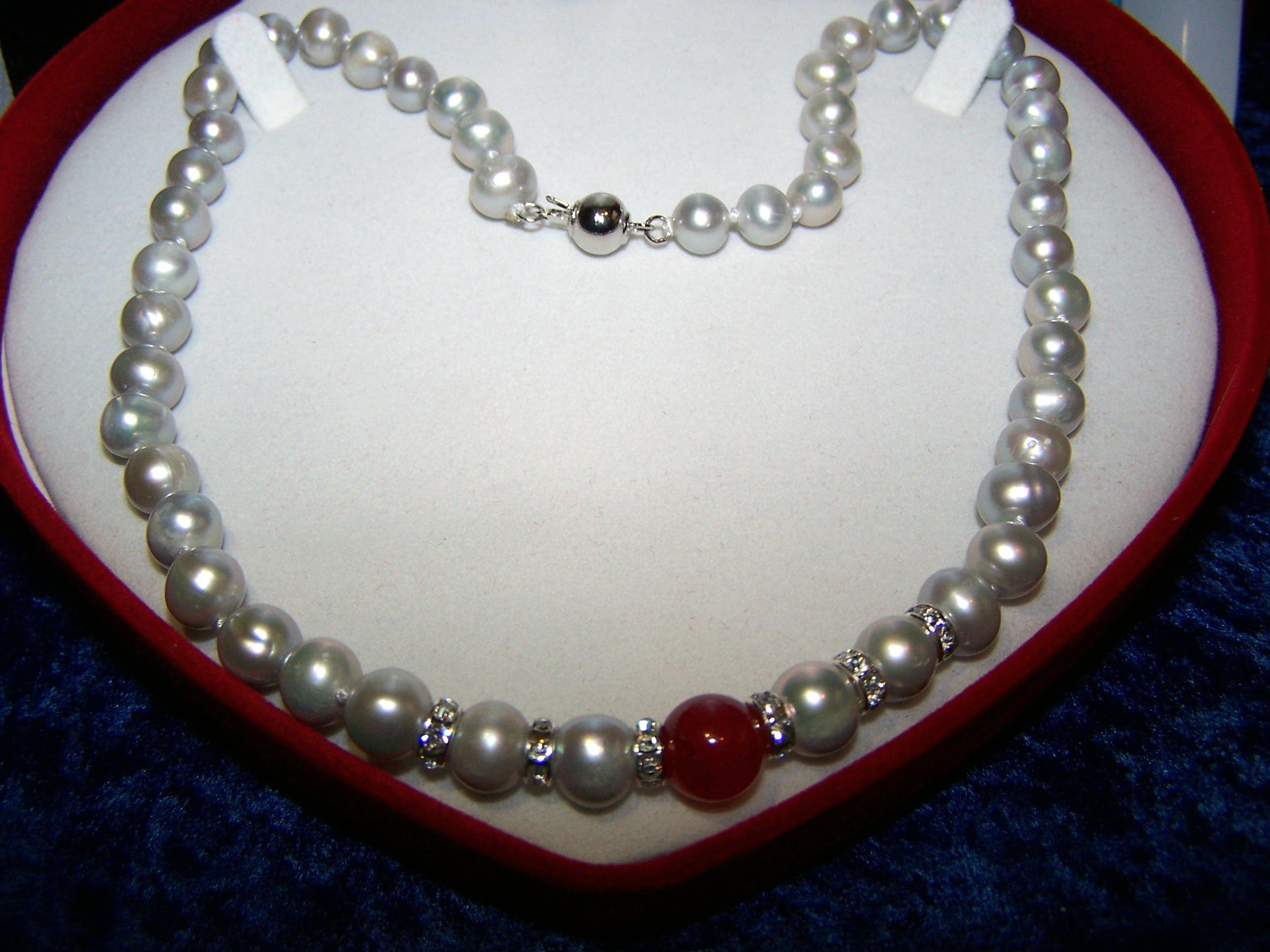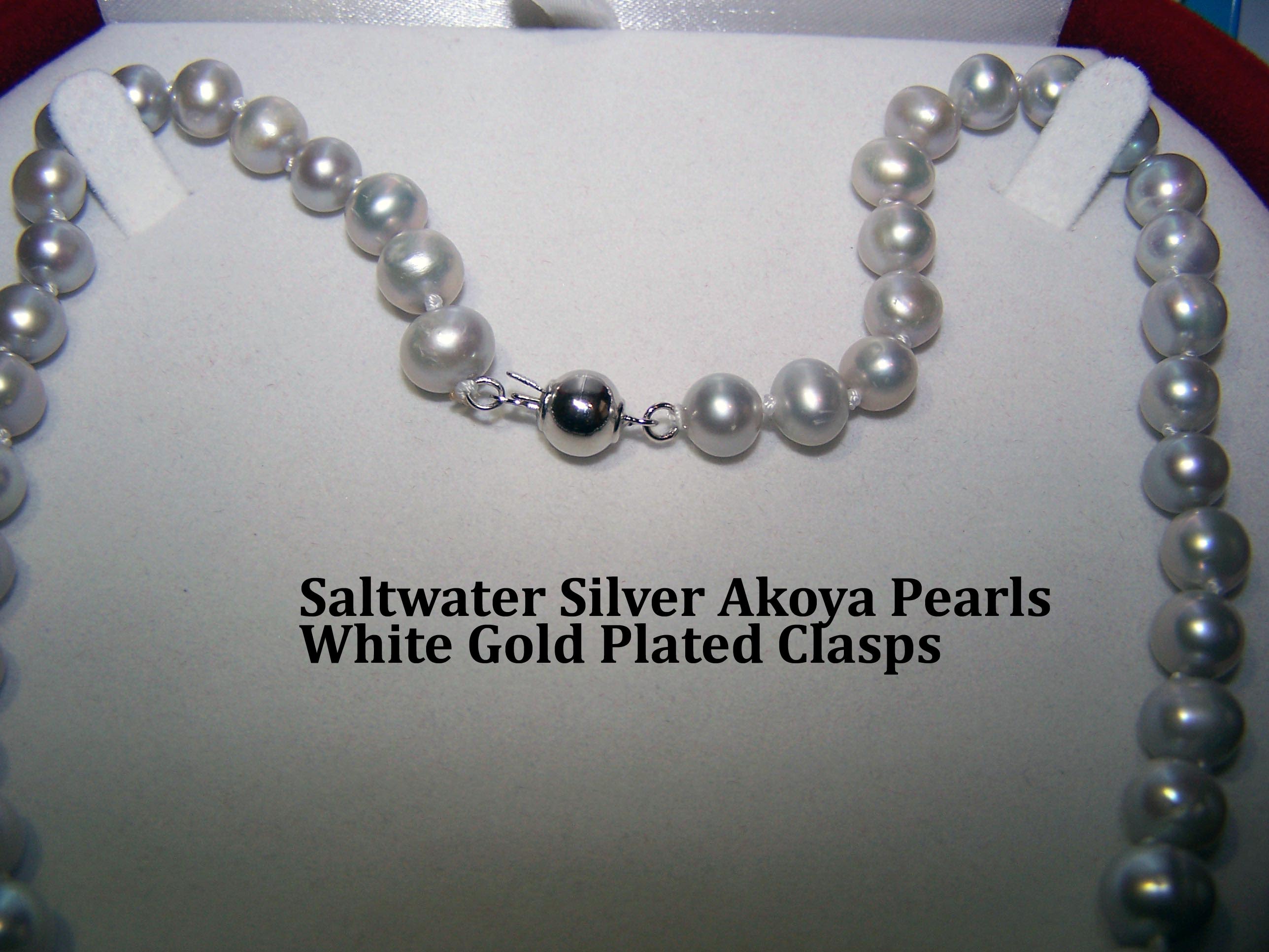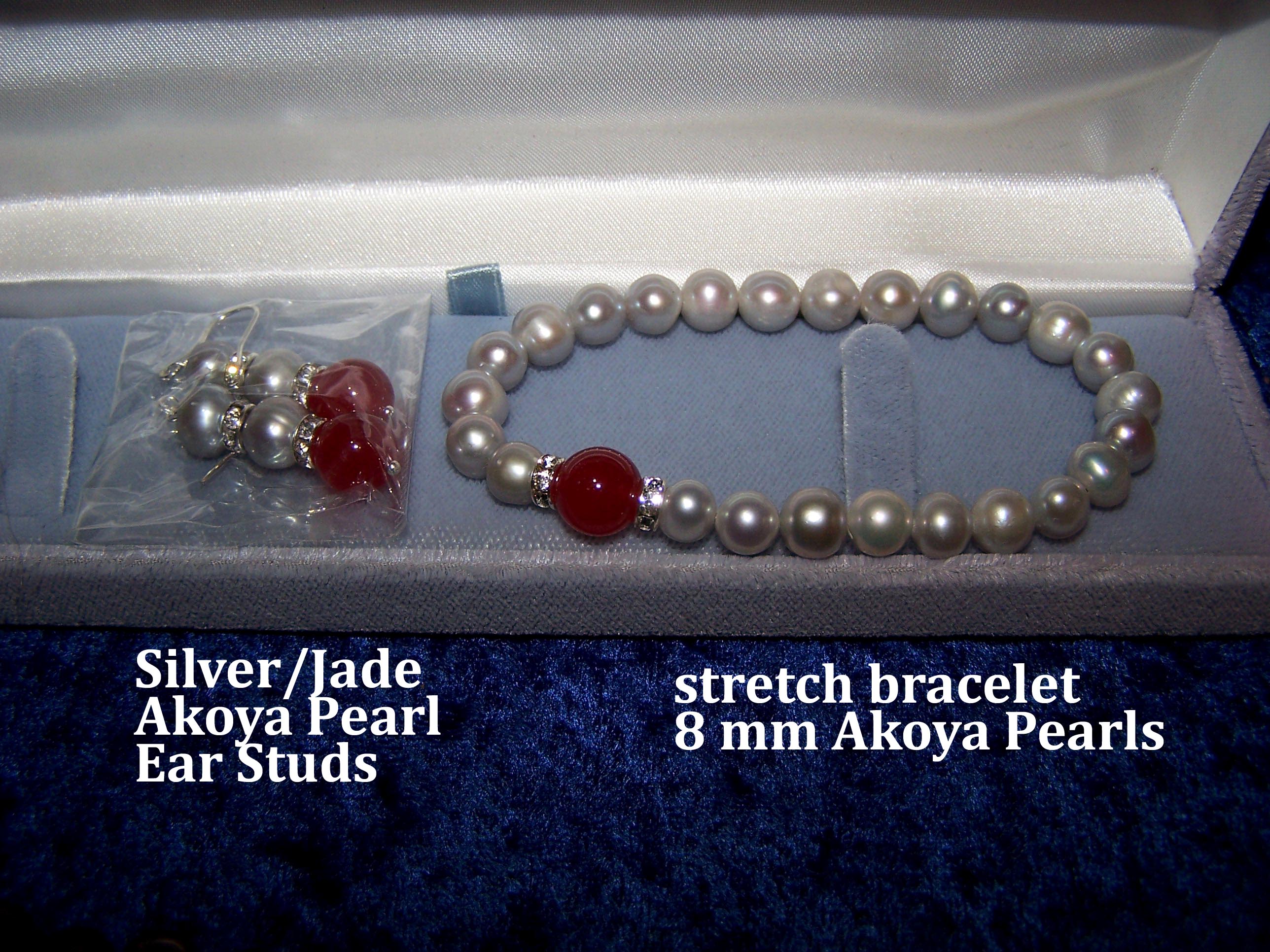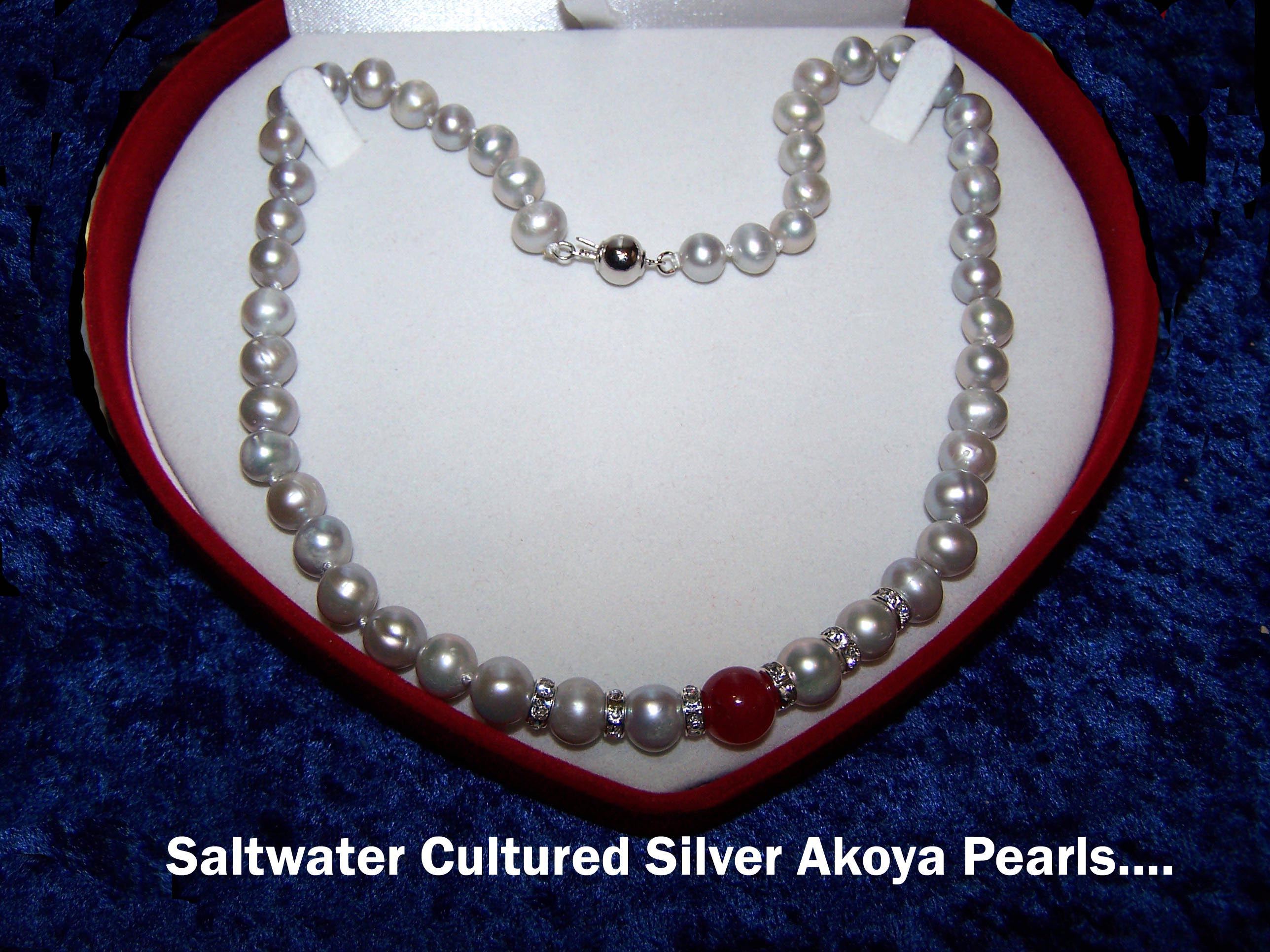 Cultured Silver/Gray Akoya Saltwater Pearls. They measure 8-8.5 mm's and are oval in shape. They have some but very few natural blemishes. The pearls have great shine and luster to them. The clasp is White Gold Plated, but not sure what Karat it is. It also has a larger red jade bead in the front. These are non graduated pearls. They have heavy nacre to them. This also comes with the matching bracelet and earrings. The necklace measures 18 inches. Very nice pearl necklace for sure.