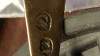 A large silver soup spoon. Made up of two pieces silver soddered together. Leaves are stamped on the bottom edge of the handle with lines outlining the handle. Marked on the front side with "G&AK". Markings on the back side are: A LUNDIN, Three Crown Drawings, P5 in a square, and a round stamp with an unreadable symbol.