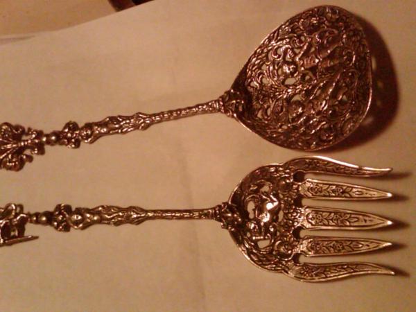 has 2 angels on the spooon and flowers .one angel is holding horn?angel on the stem.a lion face at the bottom of stem fork has a lion holing a sward?angel on steem? lion face? at the bottom of stem and a angel in the middle of the fork