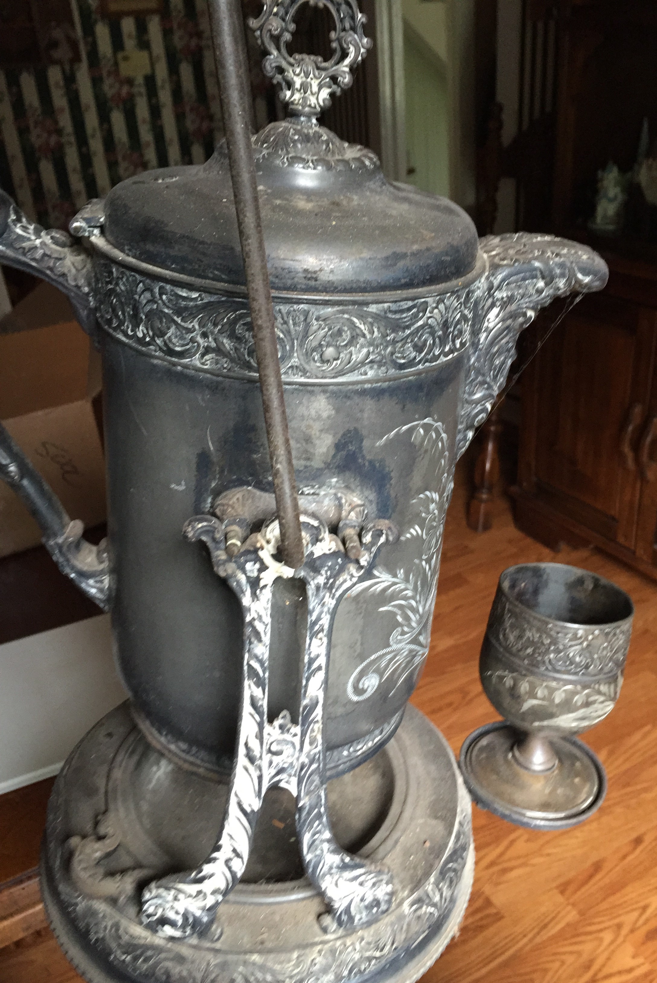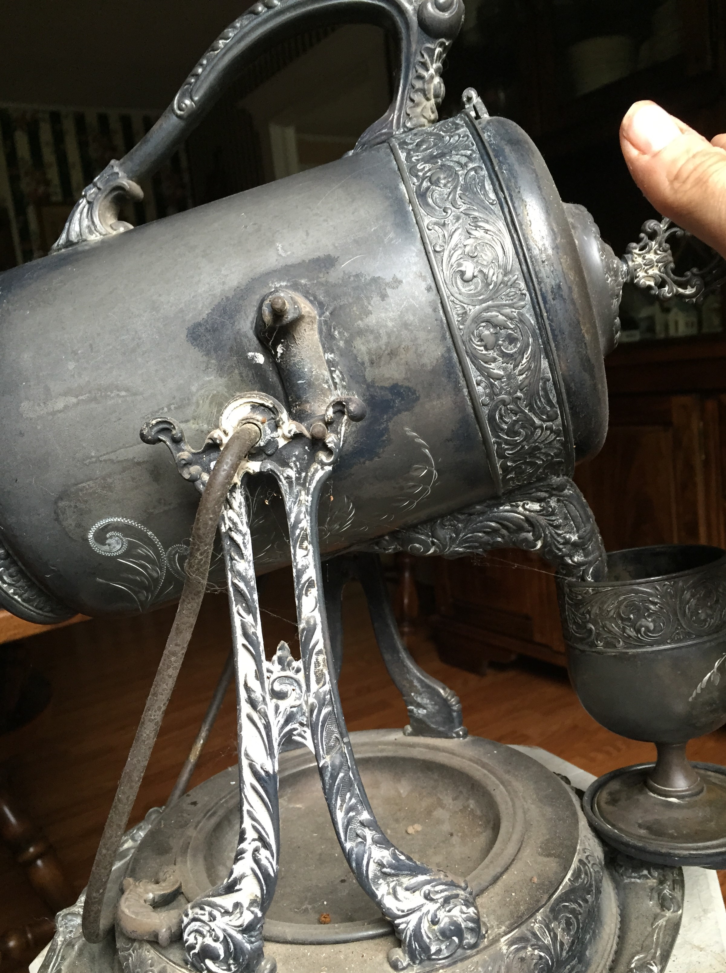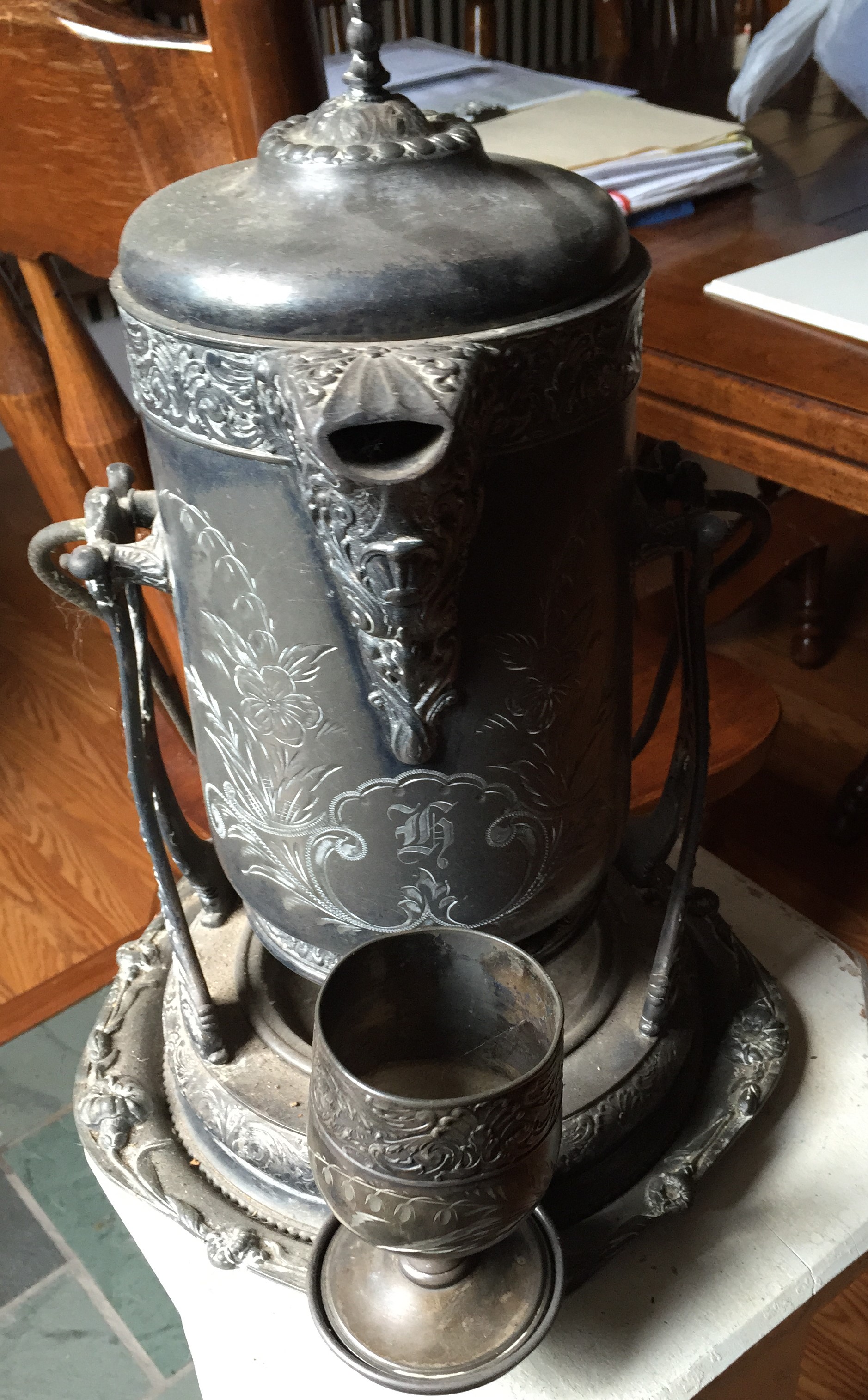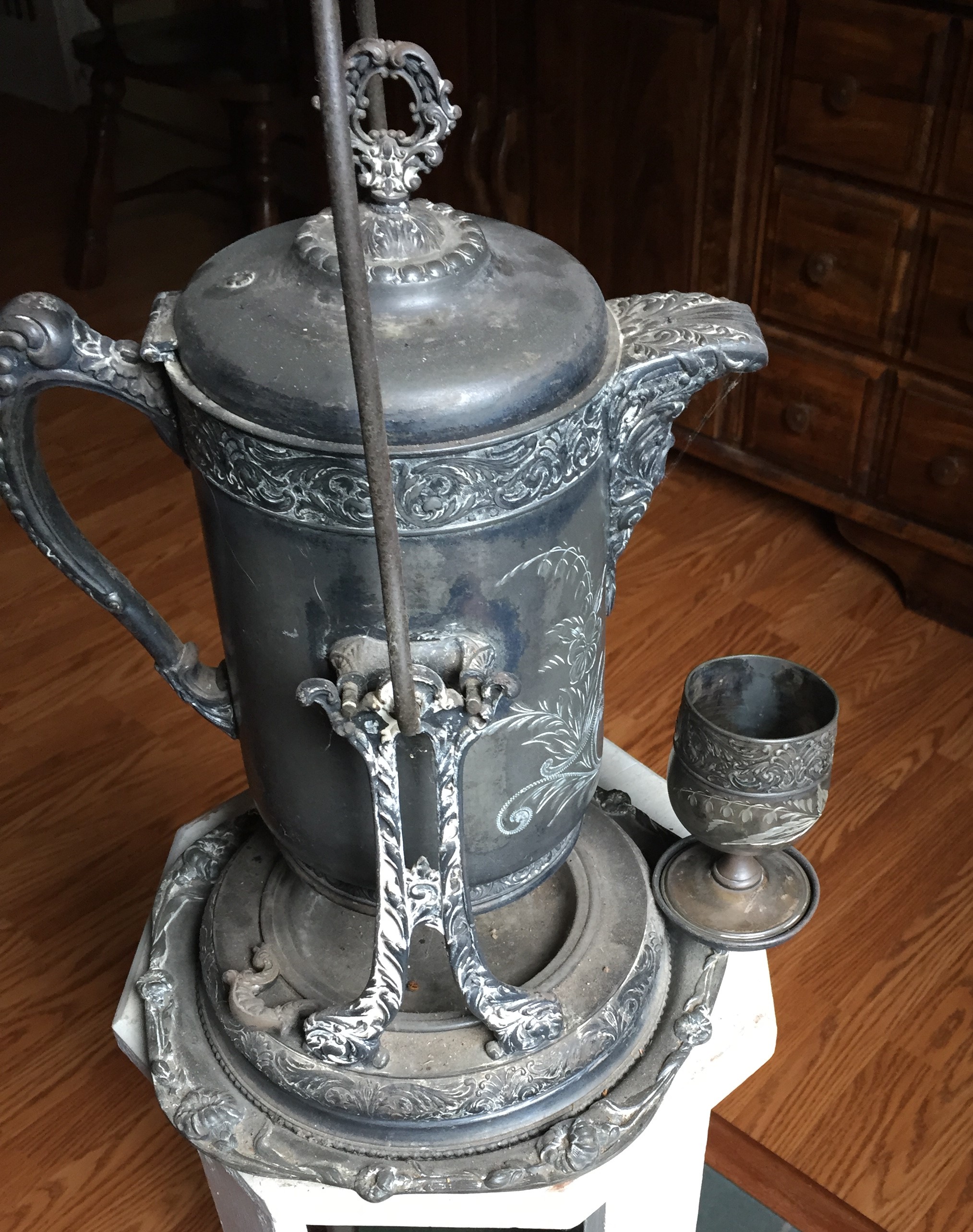It is a tea pot or coffee pot that swings back and forth with a silver cup.