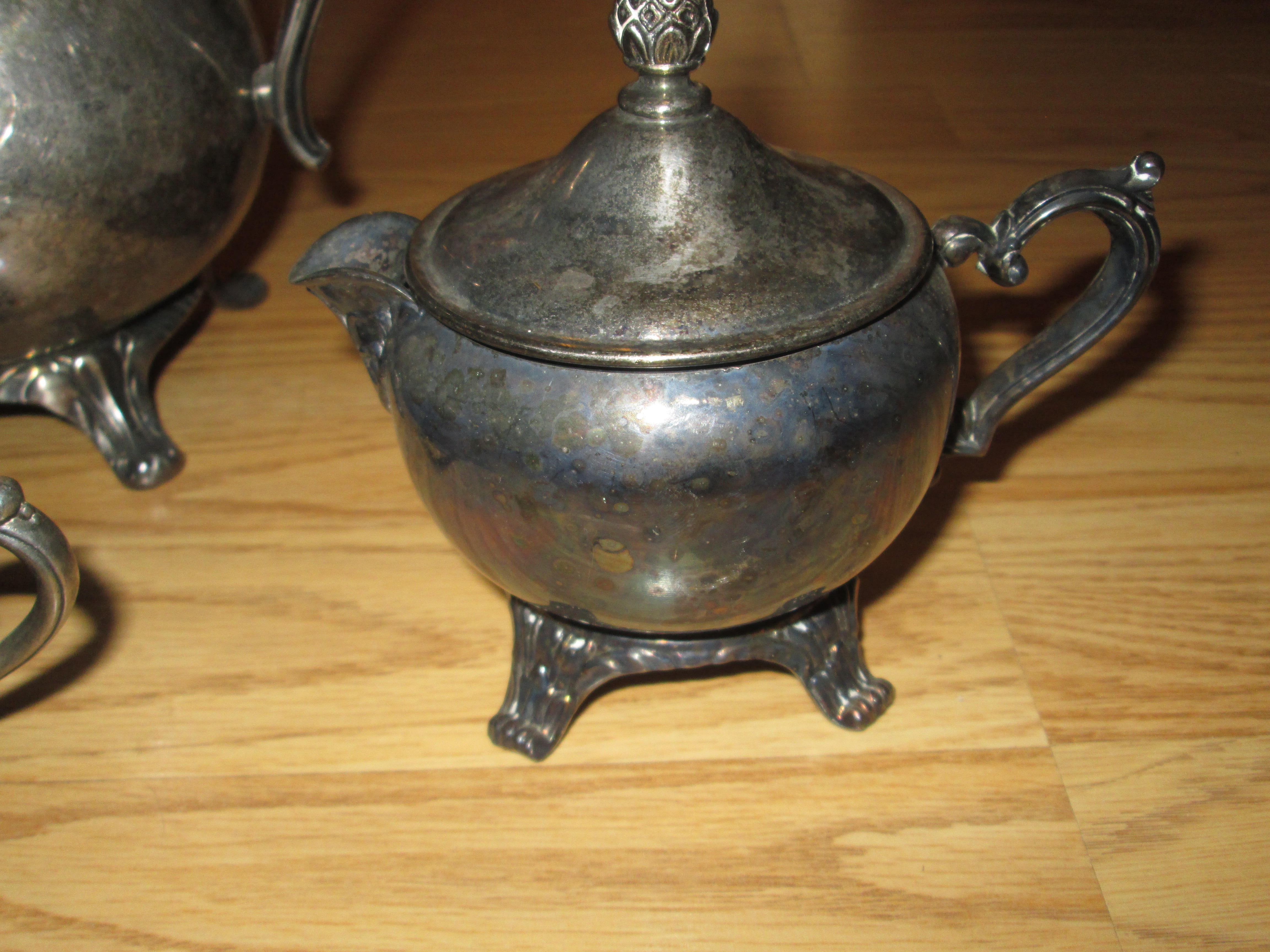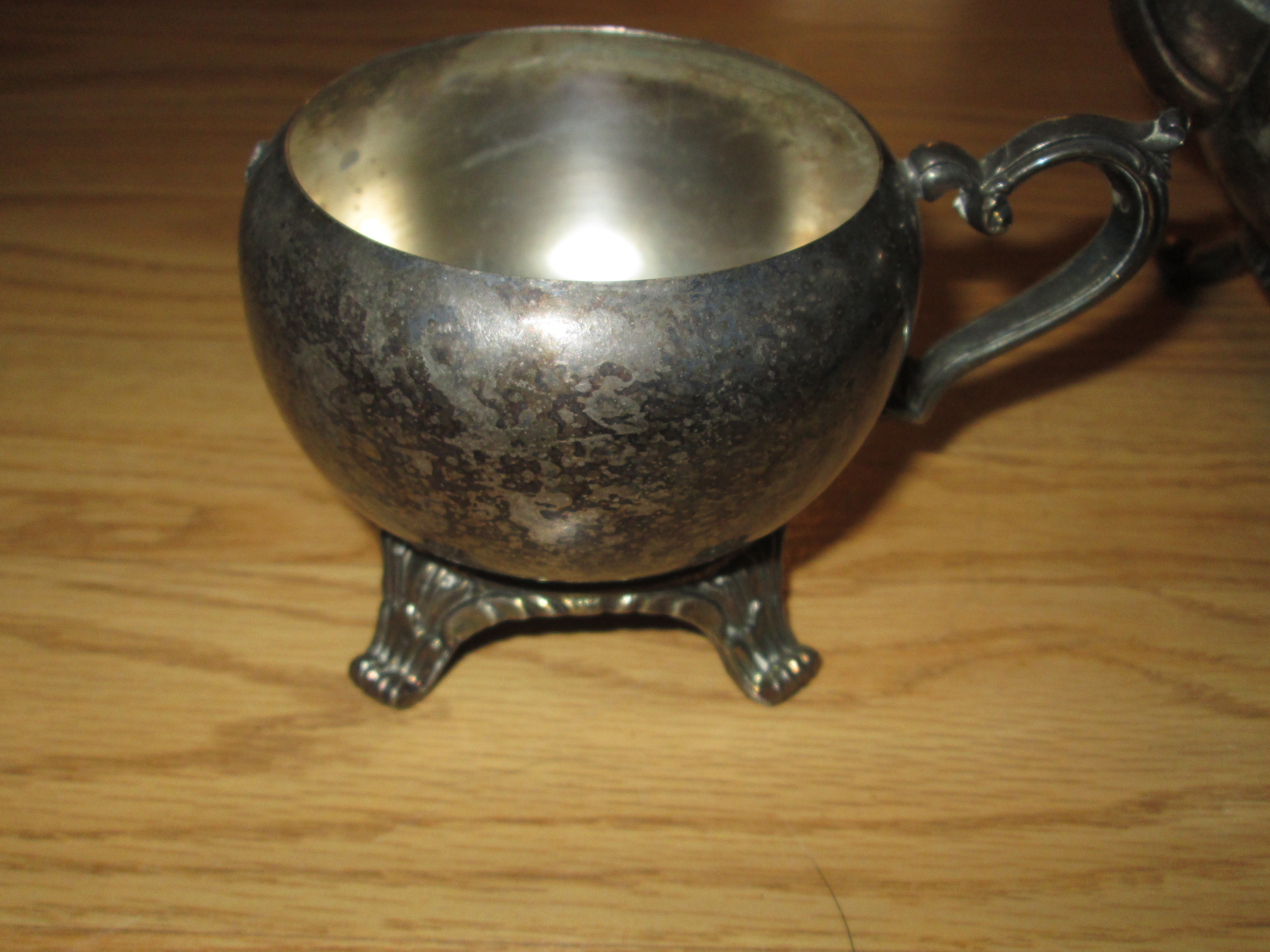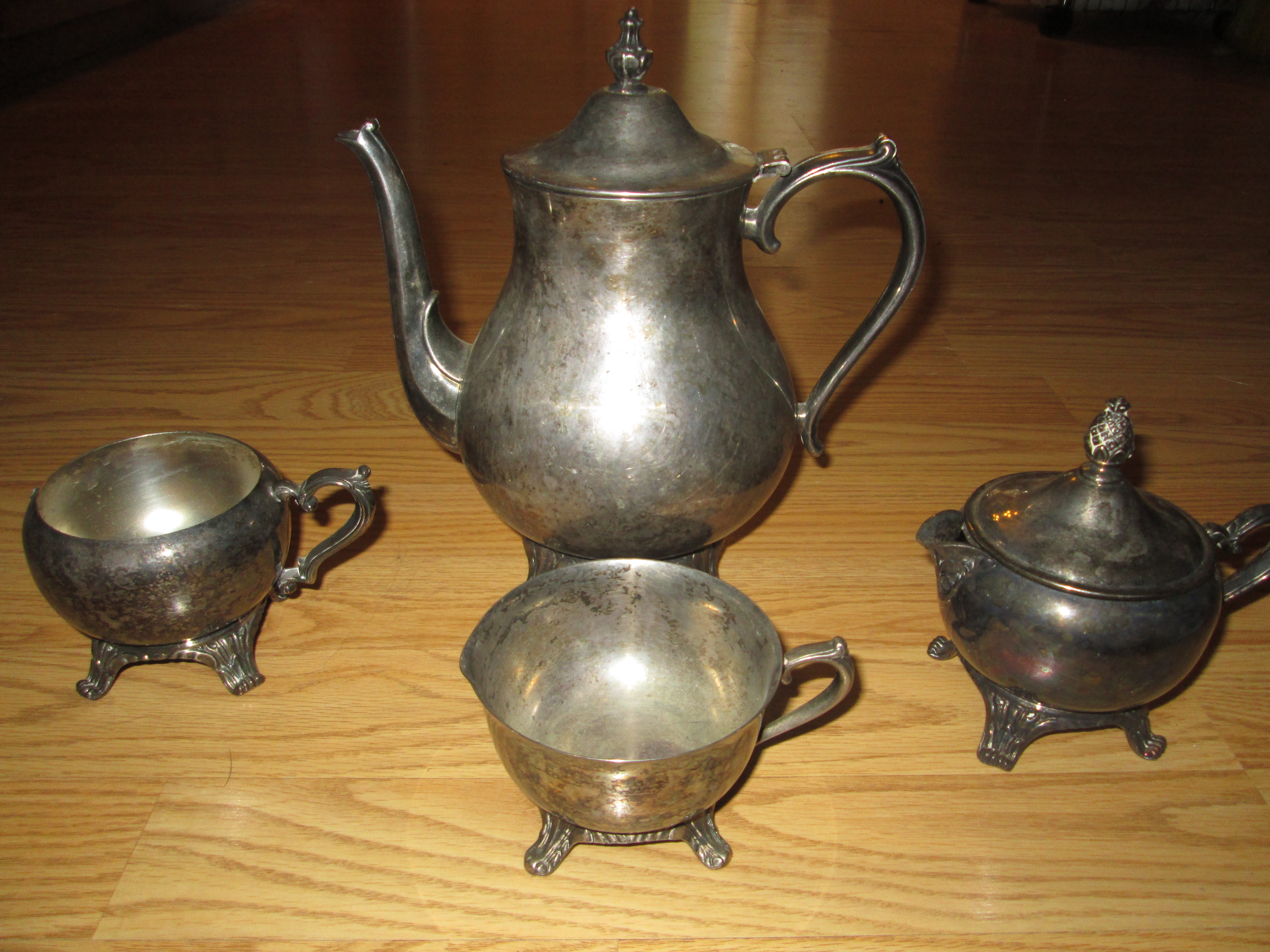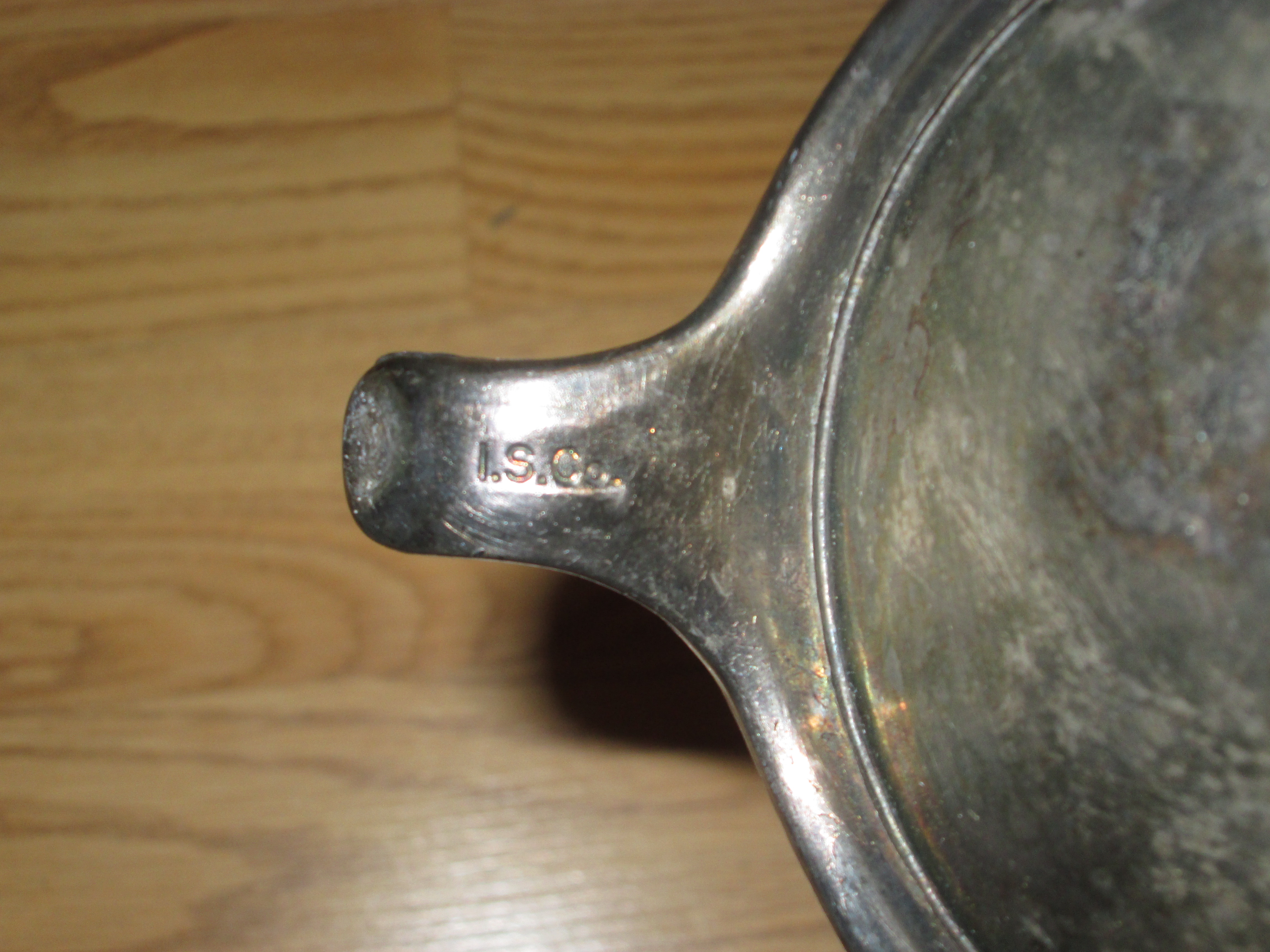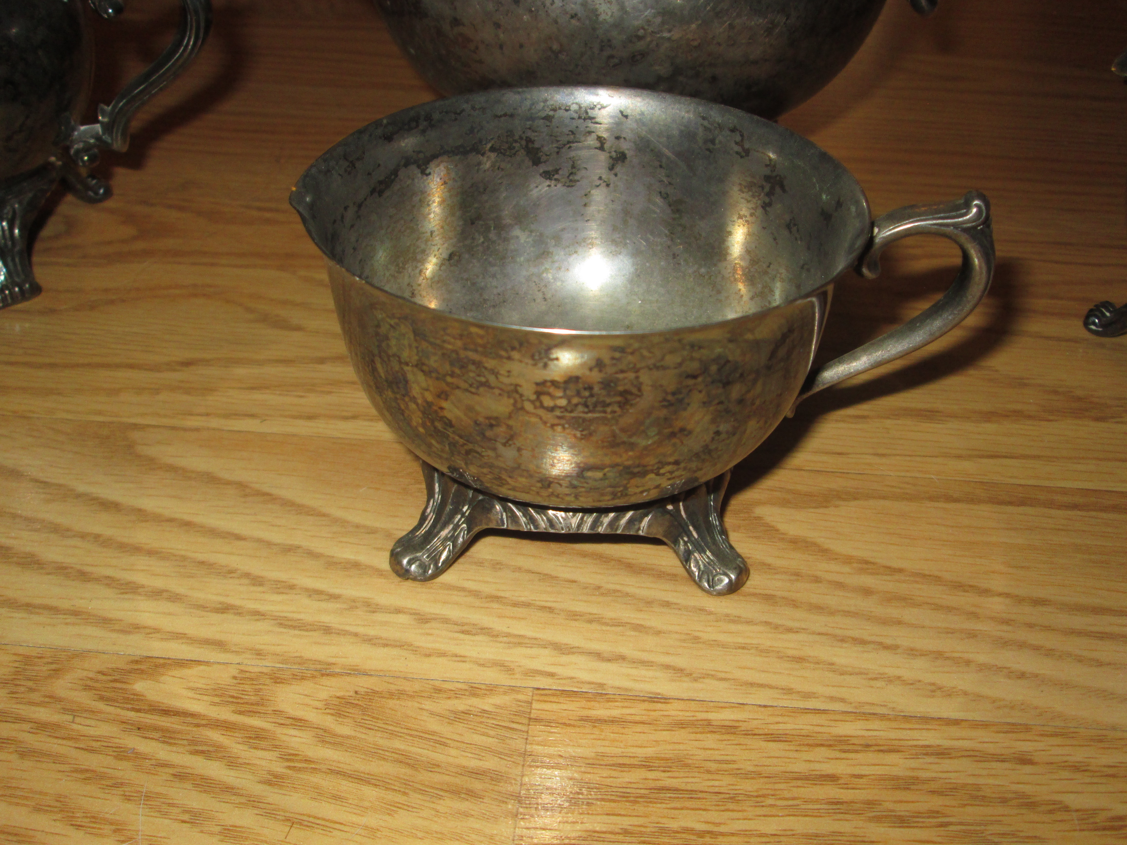 I found a neat silver teapot and cups at a local church sale, and thought they were neat. The teapot has I. S. Co. on one of it's legs, and all of them have cute little feet. Pics of the group and of each item are attached.