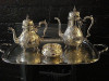 Antique silver tea and coffee service containing 6 pieces: tray with 2 handles, teapot, coffee pot, sugar bowl with handles, covered sugar bowl w/out handles, and creamer. Underneath, all pieces state: "THE SHEFFIELD SILVER C.." (markings have rubbed off after "C"); "MADE IN U.S.A."; also the letters "E", "P", "C", each of which are contained in a block/square. The tray also is numbered after the letters - "5/252", under the letters; the sugars and creamer are numbered "64", under the letters; and the tea pot and coffee pot are not numbered. The tray contains very light, intricate engravings. The tea pot and coffee pot contain a black band or insert in the upper and lower portions of the handles. These pieces are heavy and are not silver-plate. Local auctioneer says they are real silver. Condition is much better than pictured.