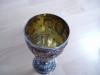 It is silver, tall with some sort of floral type design on the handled and spout. It has claw like feet.