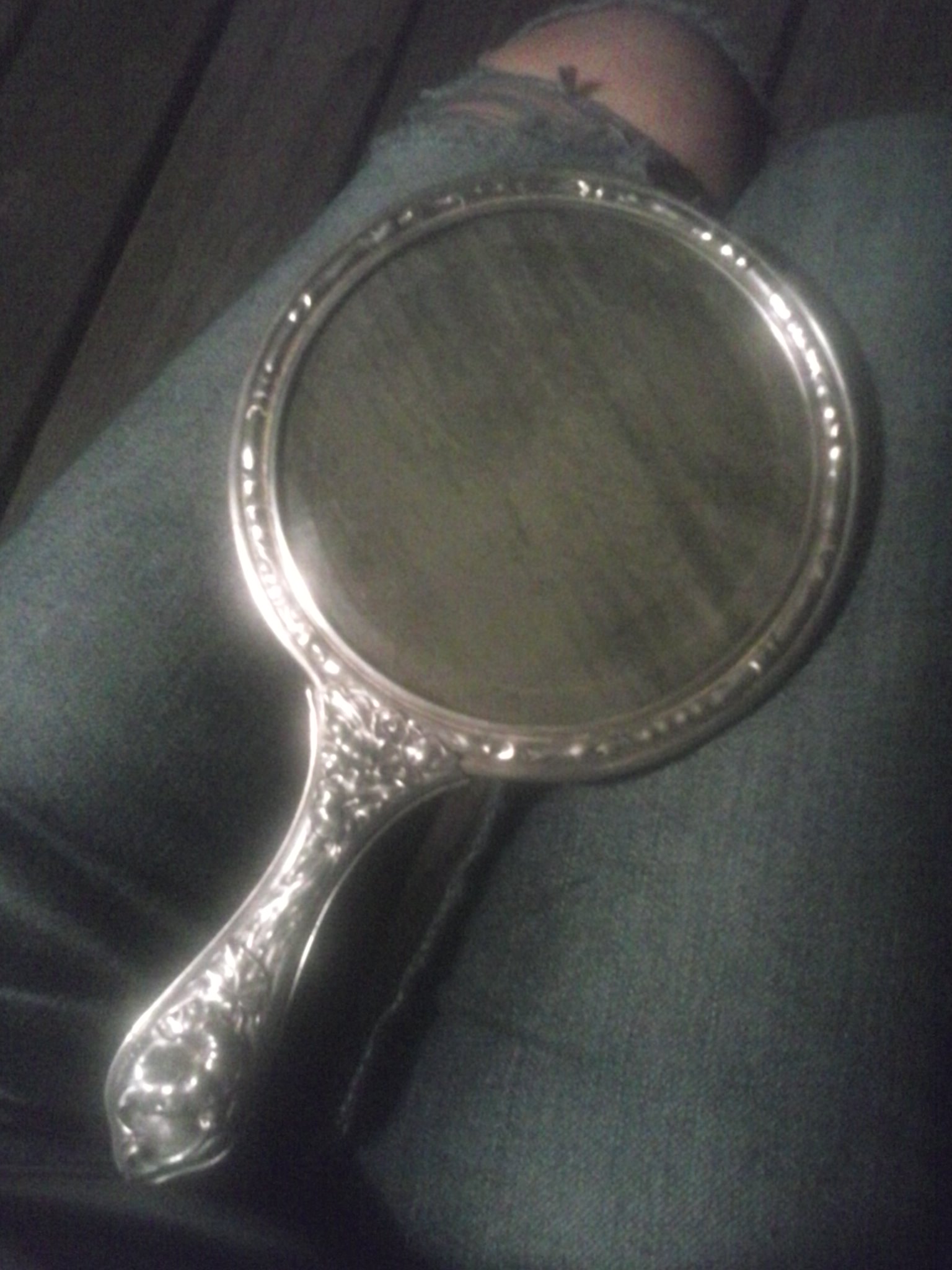 This mirror has a ceramic back. There is a beautiful white flower and around it are the colors red, green, and y_ellow. There are flowers pressed up the "silver" handle. Handle has " Patented June 13, 1905