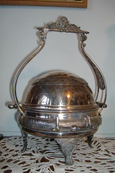 No matching butter knife. One knife rest is slightly bent in. Silverplate in good condition. No stamp but I once saw an identical piece that described as a "Reed and Barton, late 1800's". MEcahnical lid rolls well.