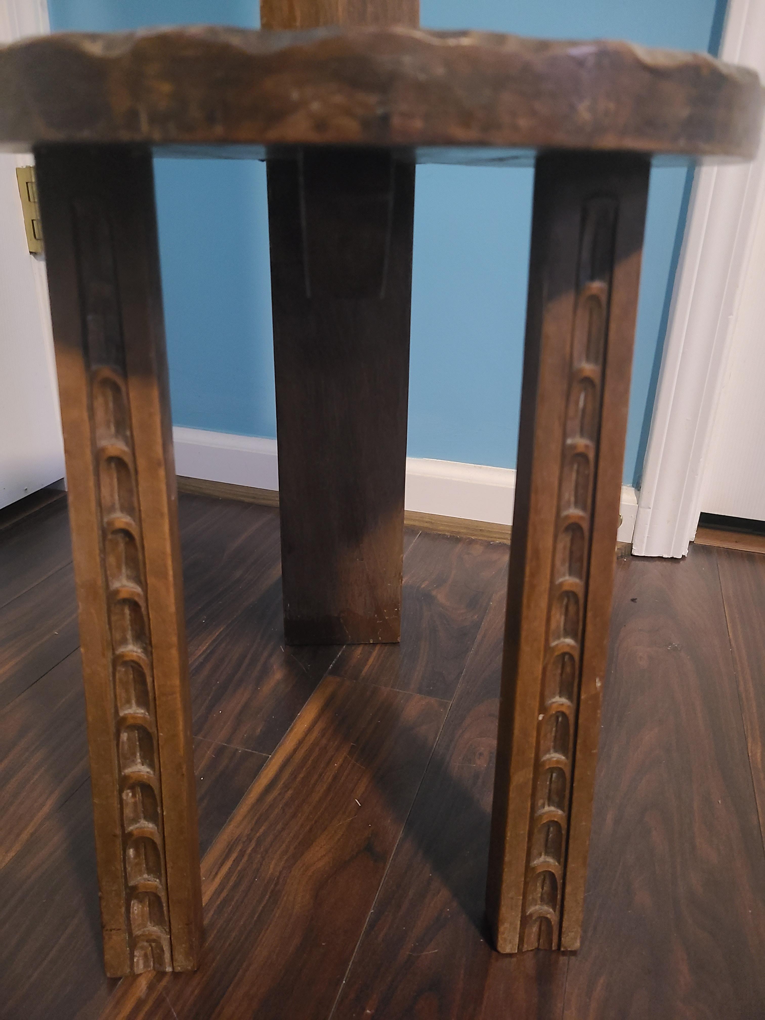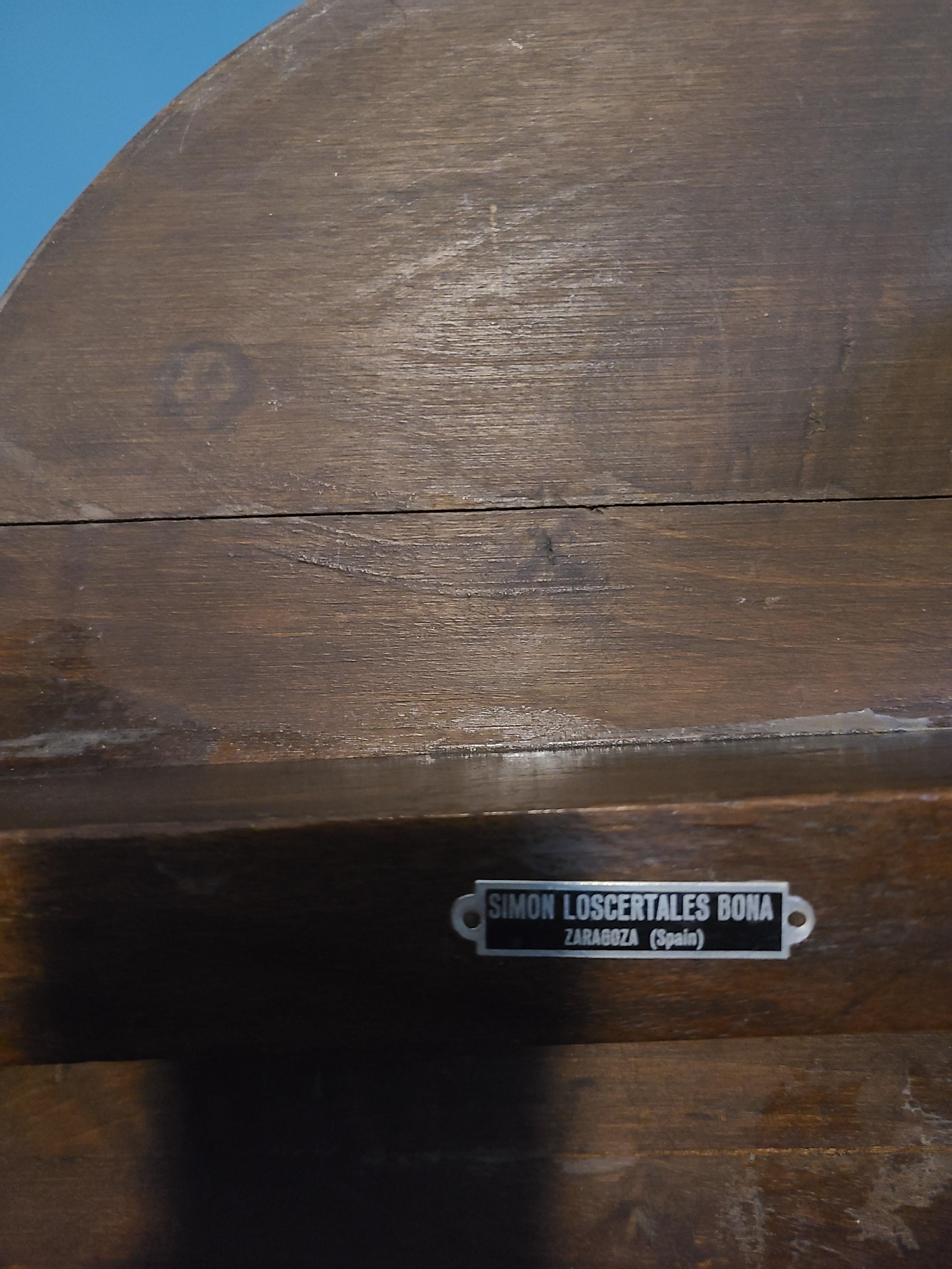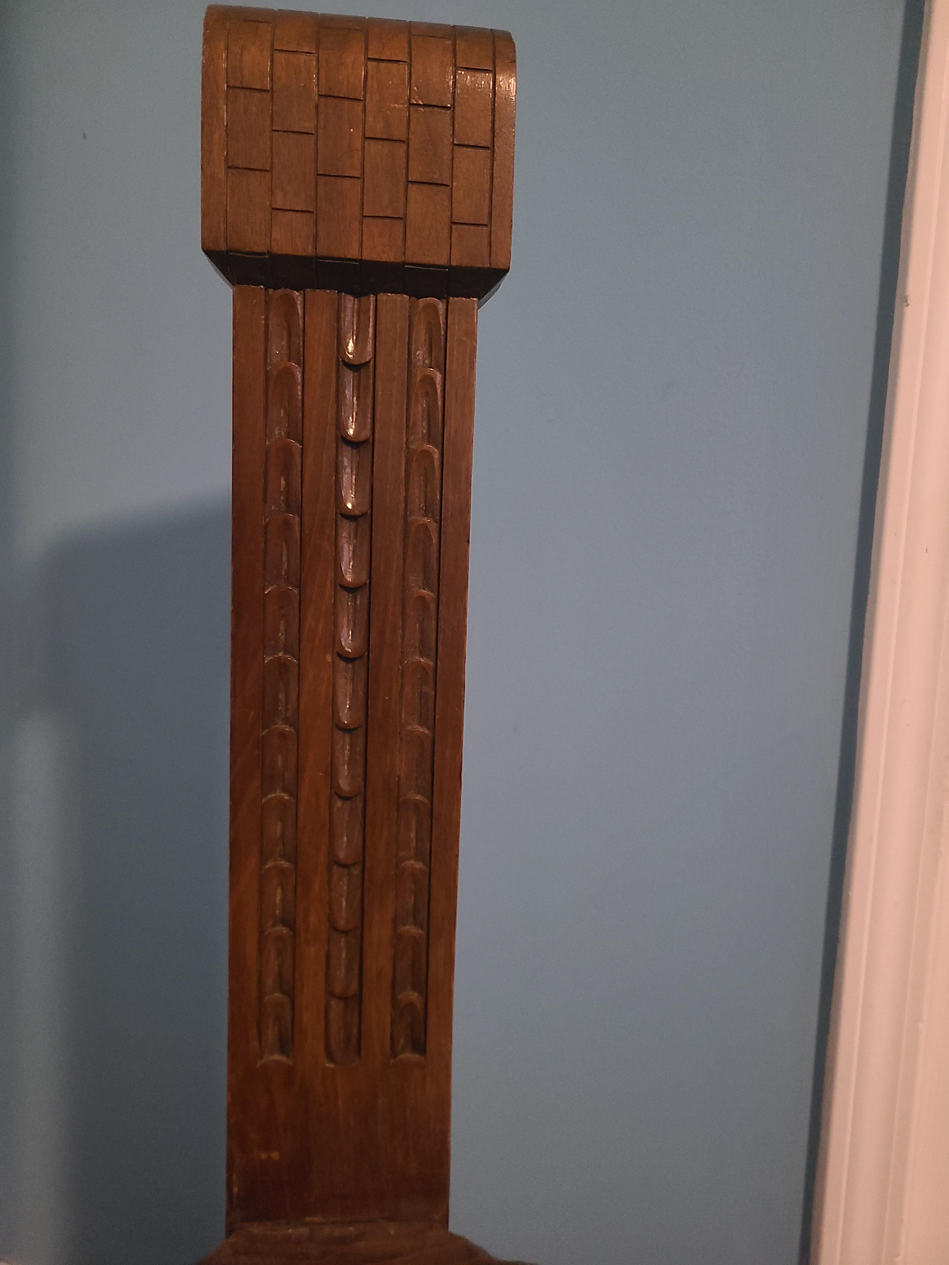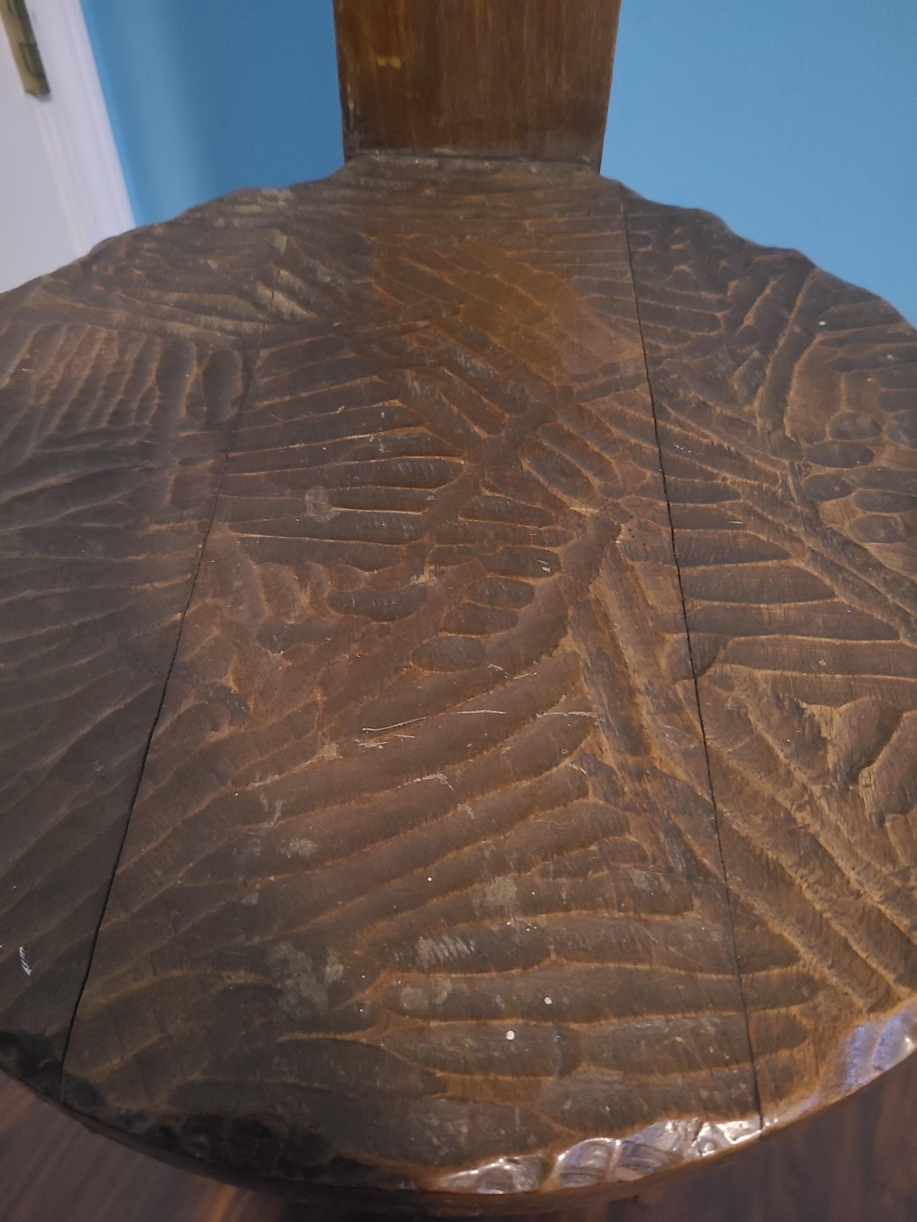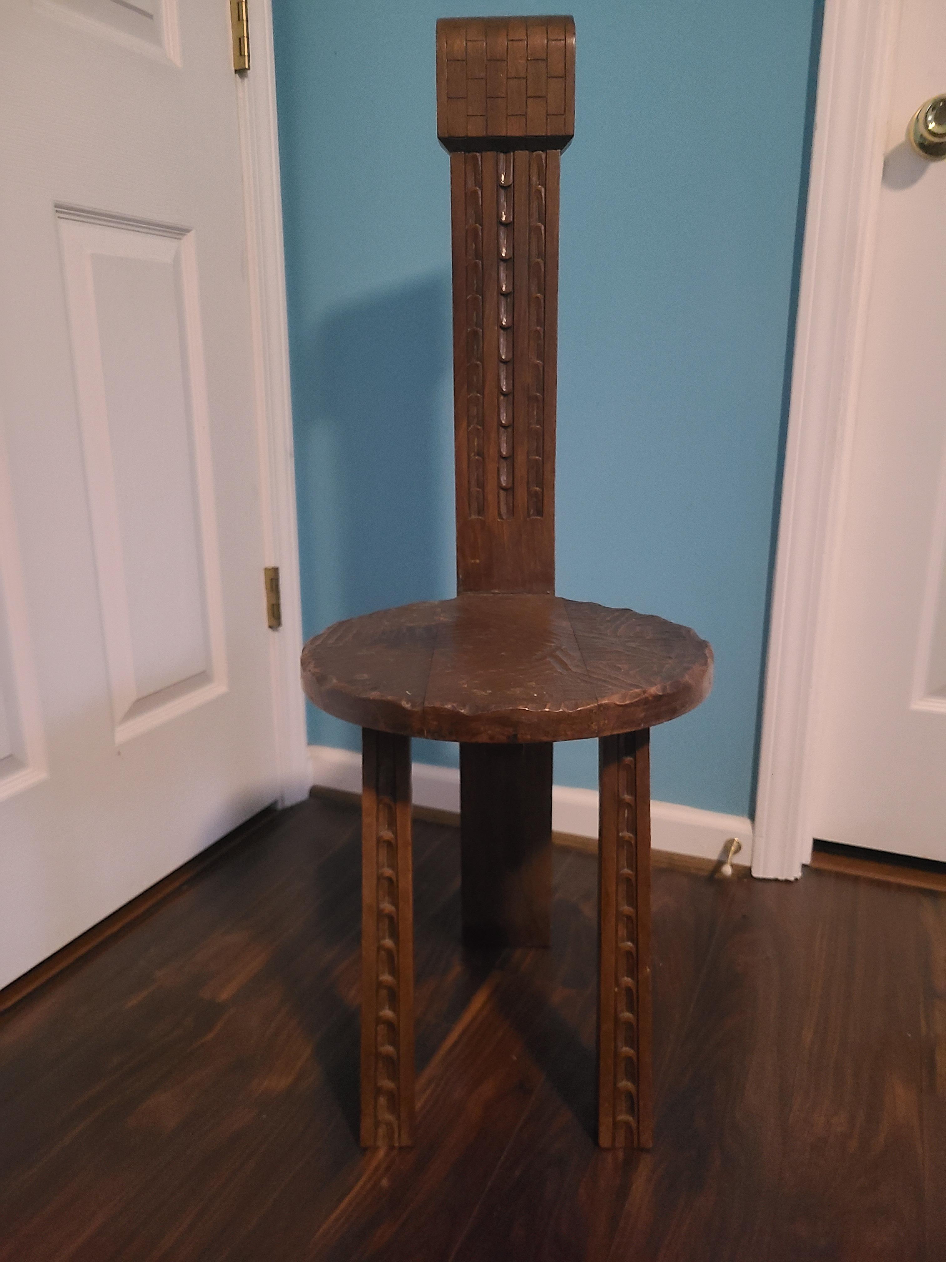 Original wooden, three-legged, metal tagged/numbered chair by Simon Loscertales Bono. Intricate details carved throughout the unique piece which can be seen on the seat, the two front legs, and the chair back.
