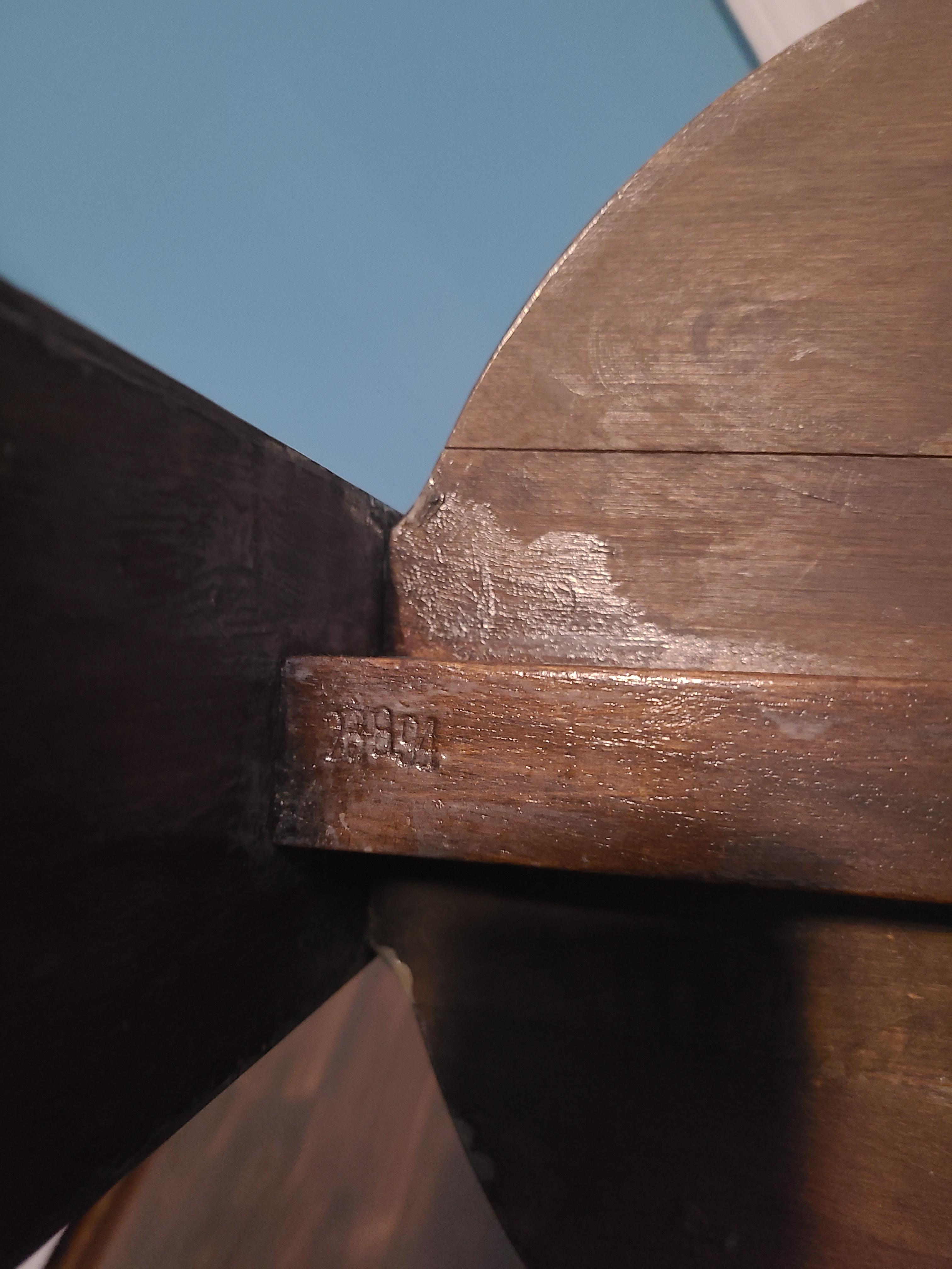 Distinguishing marks Carvings on the seat, front legs, and chair back. 28894 is carved underneath the chair near the metal tag.