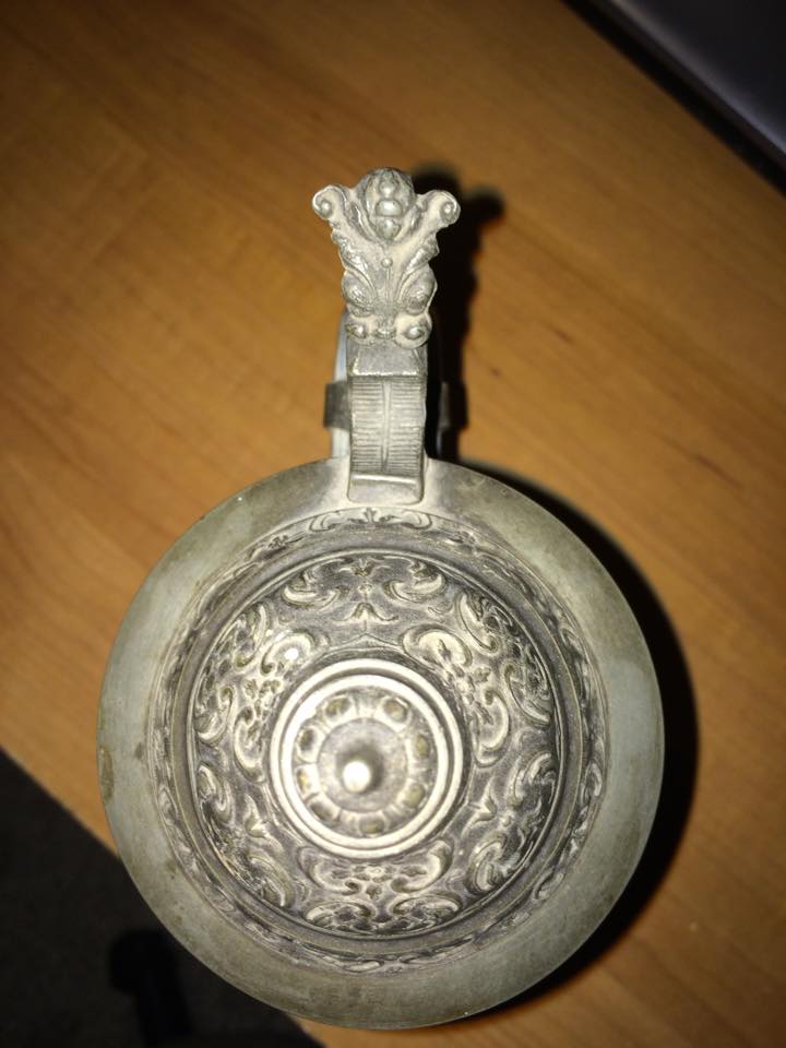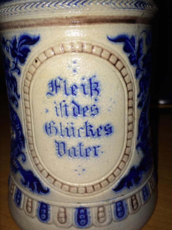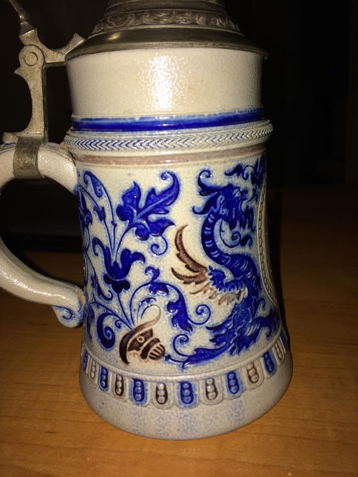 German Steins from Simon Peter Gerz, blue and white, .5 L, mark on bottom says '592 B'