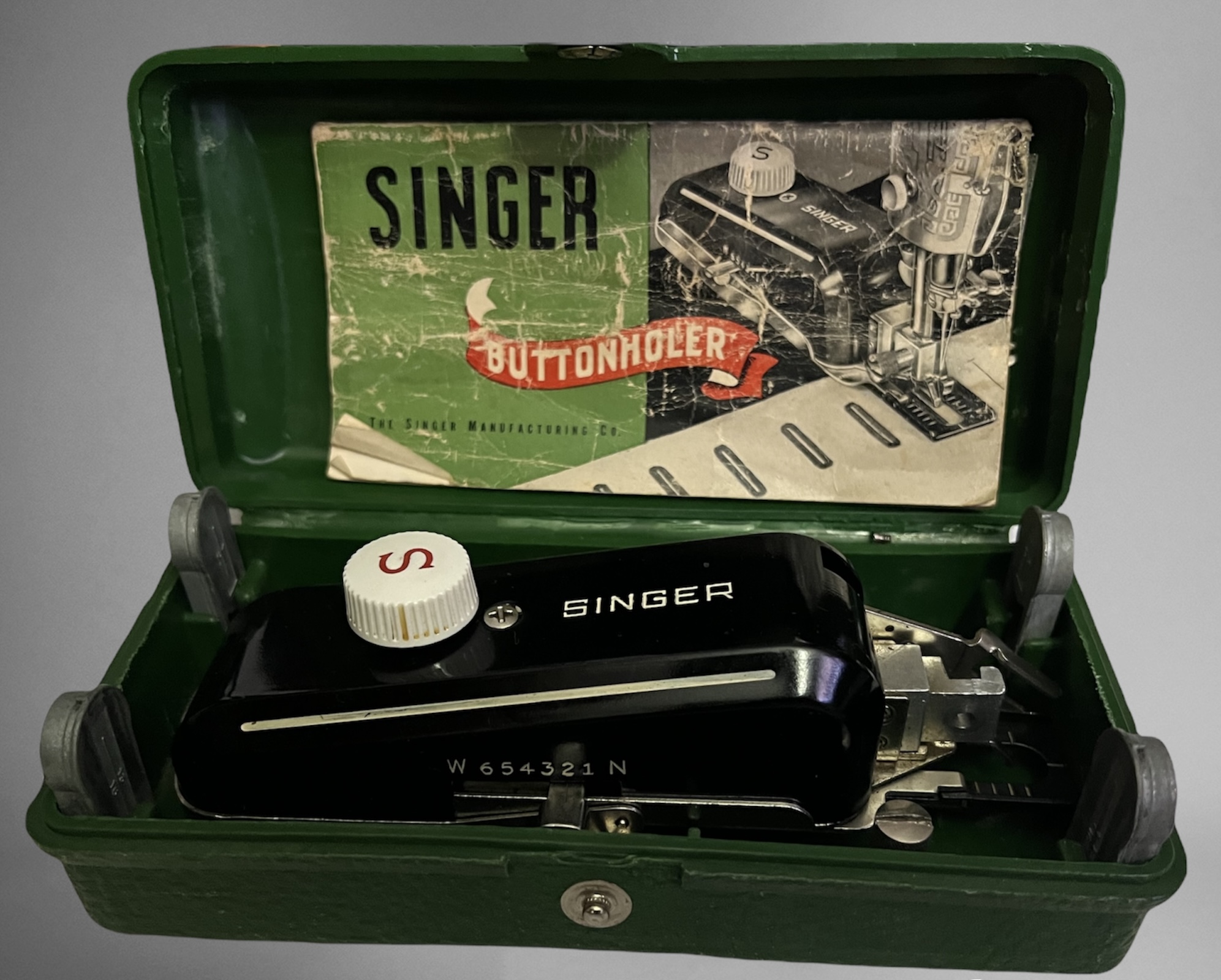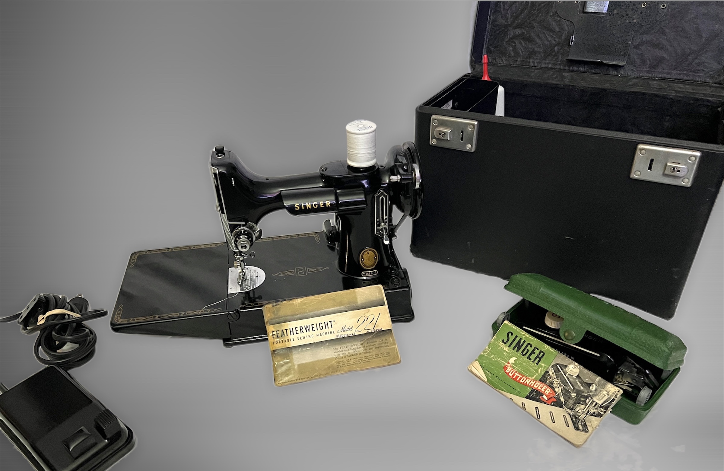 Singer featherweight 221 Jan 17 1955 Case Oil Original bobbins 45750 And Complete button holer with inserts and case