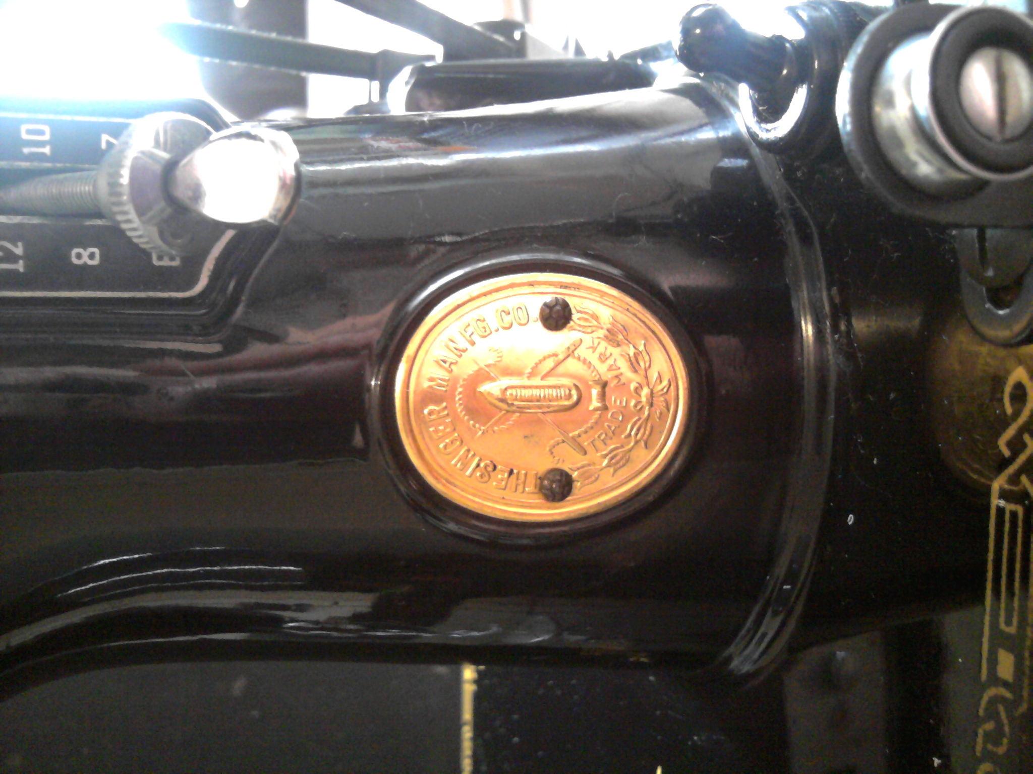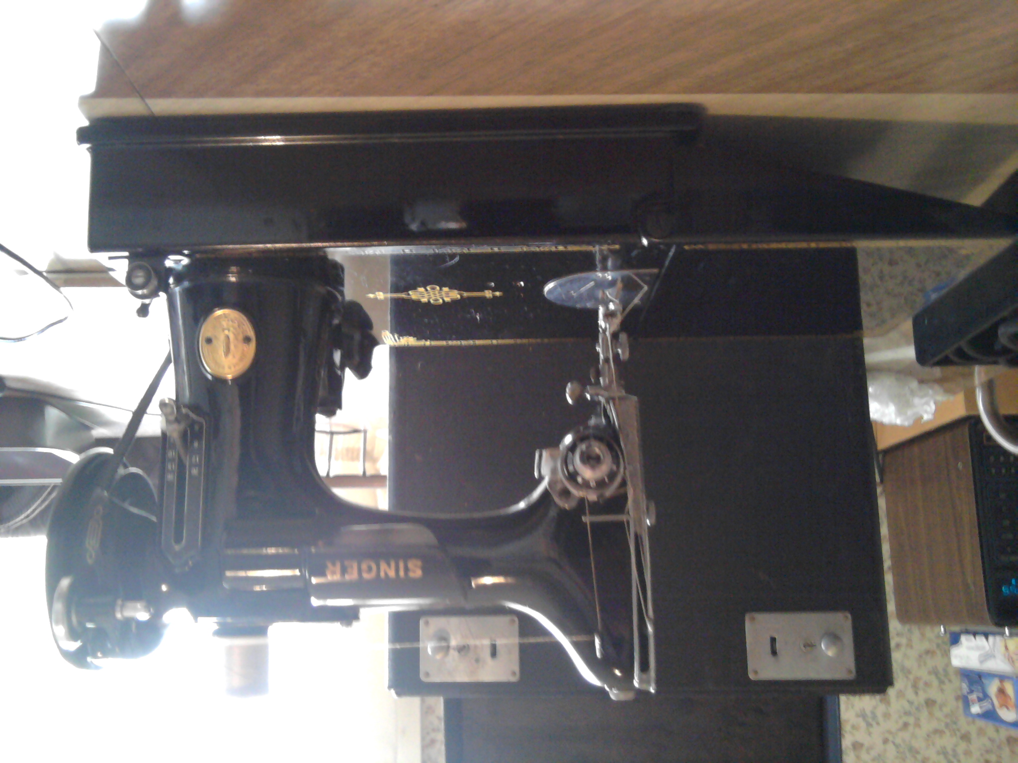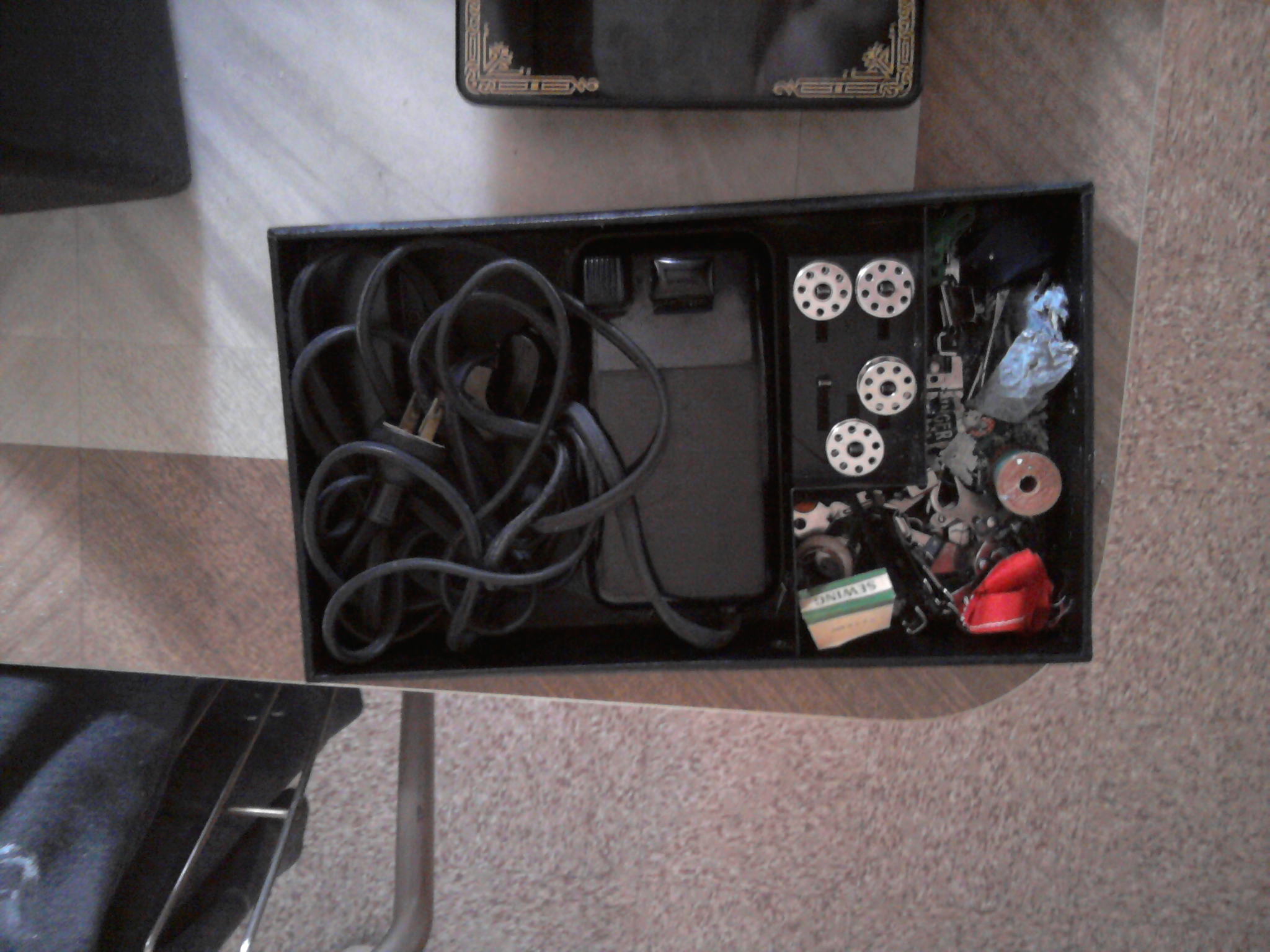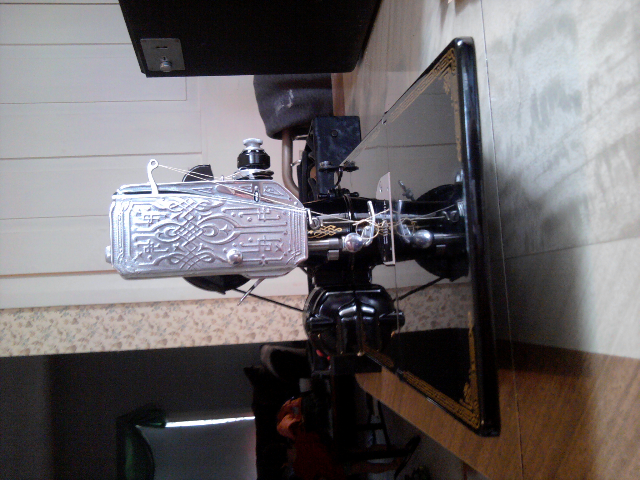 the machine is all original and works! original parts, original needles, original case. it is black, with a gold design throughout the machine. and has a silver design on the front.