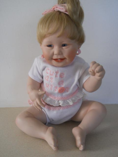 These two dolls look like they come from the same company. I know the doll with the with light eyes was from Ashton Drake at one time. Very heavy porcelain on both. The one with light eyes was called Cute as a button with 2-pc outfit. Artist was Titus Tomehu and the one with green eyes has auburn hair 1995 m81 or mB1 on neck by Elre Hutchehs?