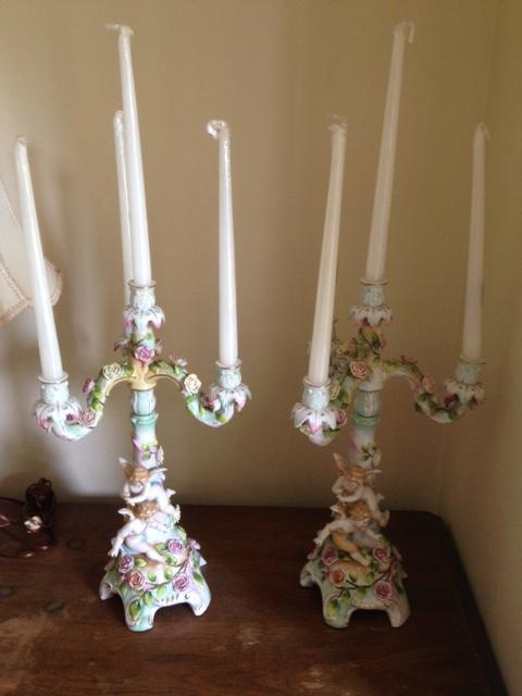 Pair of Sitzendorf cancelabras. Very ornate with long candles.