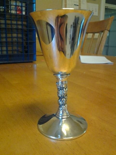 Small silver plated goblet. Detailed spiraling pattern on the stem. Bell shaped goblet.