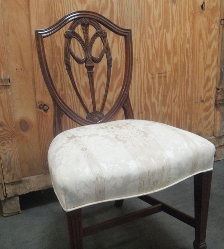 SIX CLASSIC ANTIQUE MAHOGANY DINGING ROOM CHAIRS..DAMASK UPHOLSETERY..37'HX SEAT 21'W