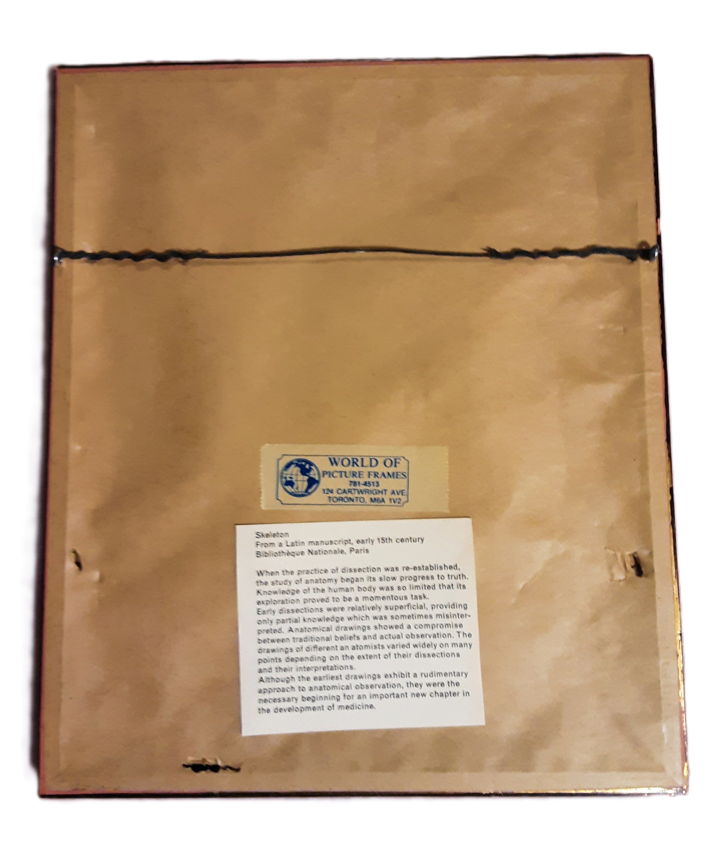 This framed anatomical drawing is labeled as a reproduction from an early 15th-century Latin manuscript, with origins linked to the Bibliothèque Nationale in Paris. The text appears to be in Latin and represents an anatomical diagram, likely copied to assist practicing doctors. The item shows characteristics consistent with educational or scientific study materials from the period when anatomical exploration was being rediscovered in medieval Europe.