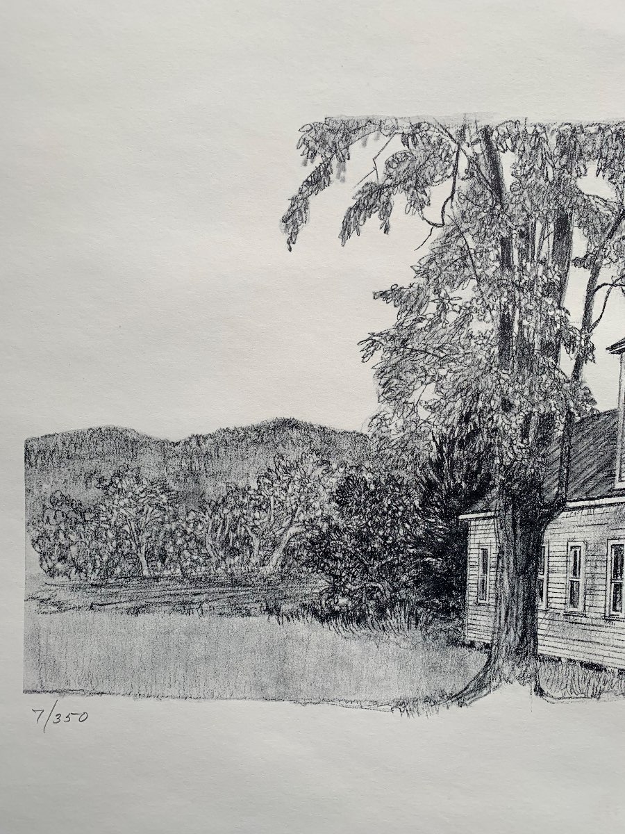 Physical Description: This is a black and white sketch depicting a quaint building surrounded by trees and mountains in the background. The artwork is signed by the artist, R. Loehle, and is numbered 7/350, indicating it is part of a limited edition of 350 prints. The dimensions of the piece are approximately 11 x 14 inches, printed on high-quality paper.