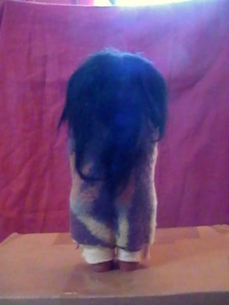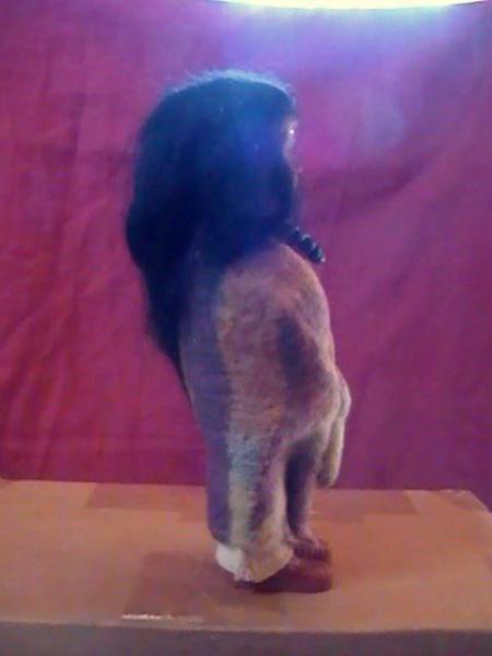 It is an Indian Girl wearing a purple, yellow and and orange blanket. True to Skookum tradition she does not have arms, her head does not move and her eyes look to the right.
