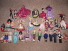The wand-like stick is 15 inches long and the total length of the doll/wand is 26 inches.  The ruff around her neck is ecru synthetic lace, her hair seems to be saran, and the head and face seem to be a high-quality molded plastic, but her face has the look of porcelain bisque. Her jester cap is made of challis print fabric, filled with some sort of stuffing, and has small jingle bells attached. The wand appears to be painted wooden dowel, wrapped with upholstery braid.  Her eyes open and close with the movement of the wand. Delicate decoration above her eyes gives the doll a fantasy or fairy-like appearance.  I cannot find any markings.