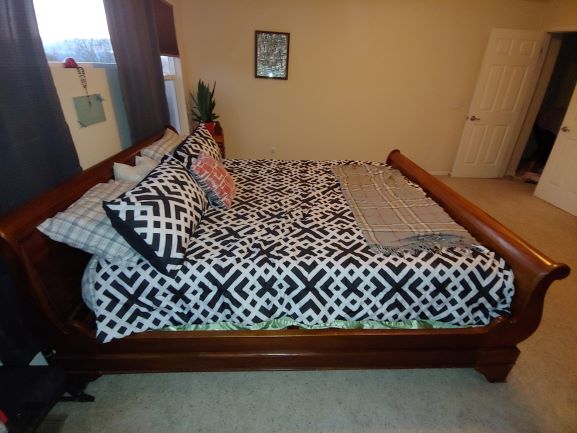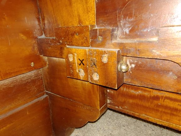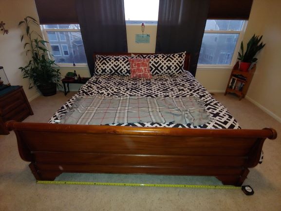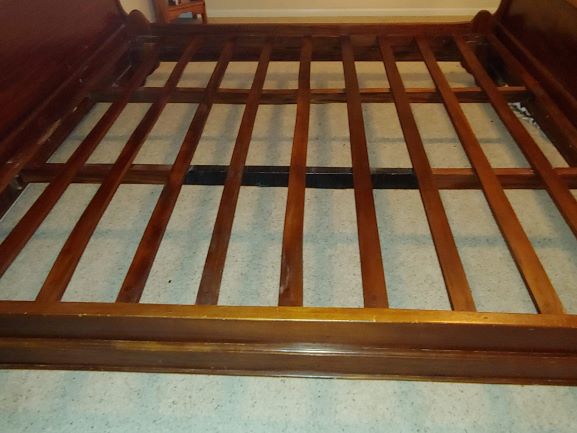 I do not have history on this piece. It was purchased from a auction and given to me over 18 years ago. It is very large "Cali King size". One of the support slats had split a long time ago and would need repaired. Mattress slats are all cut different and have warping. Each one fits into a specific location, possible hand cut. Some spall wood pieces that the hardware screws into have loosened or split. I am looking for help in identifying this piece including what it is, age and value range.