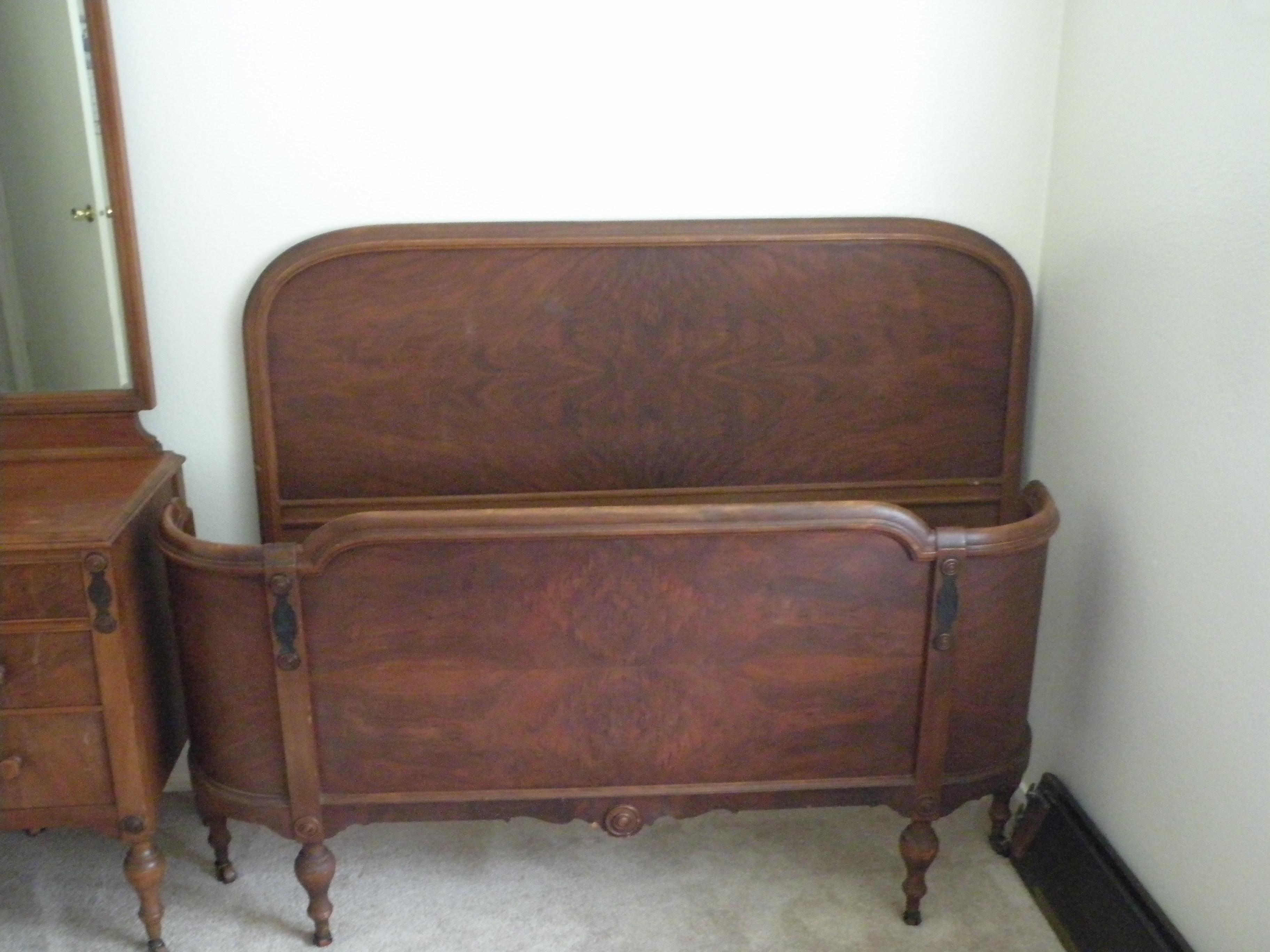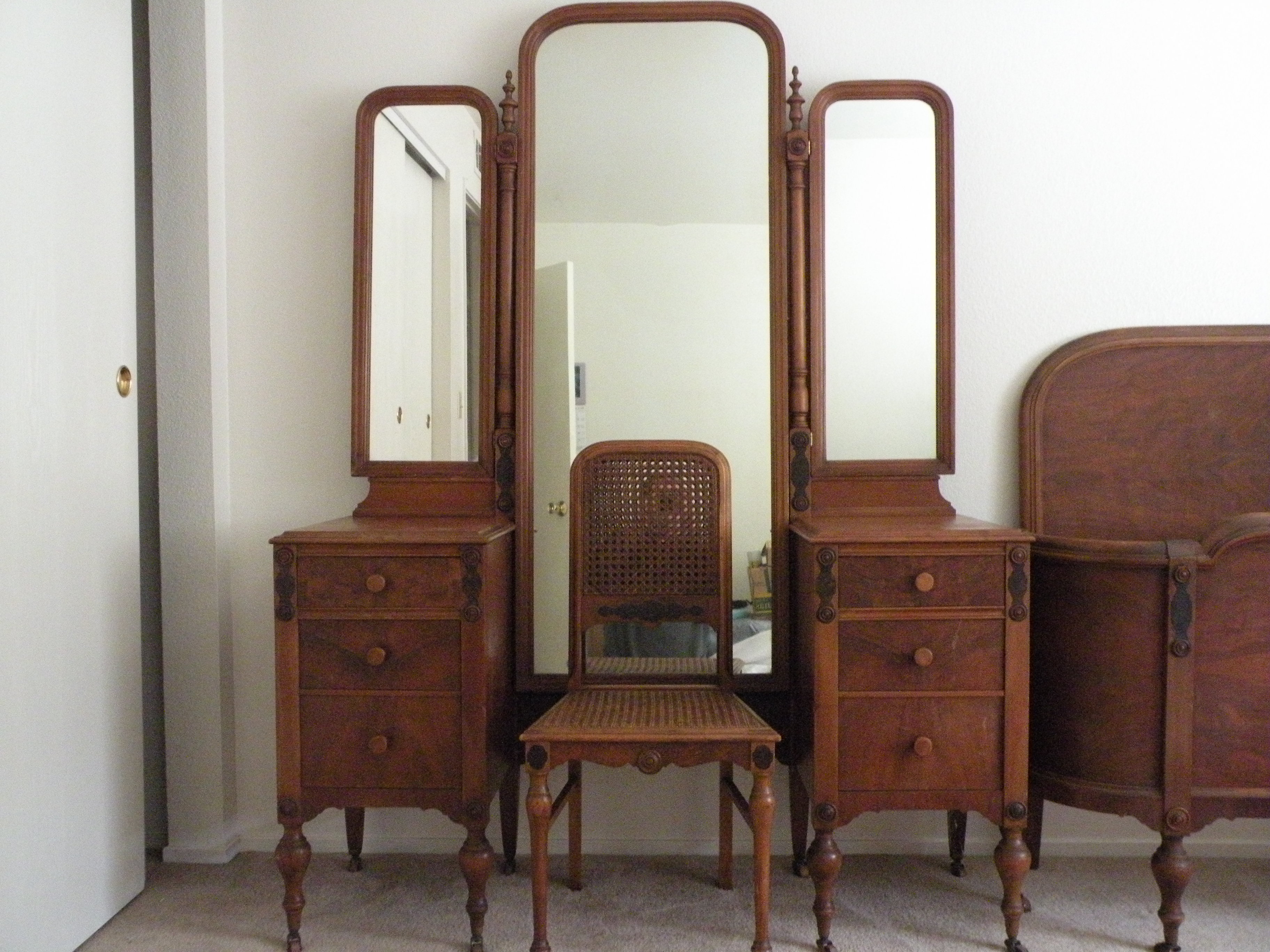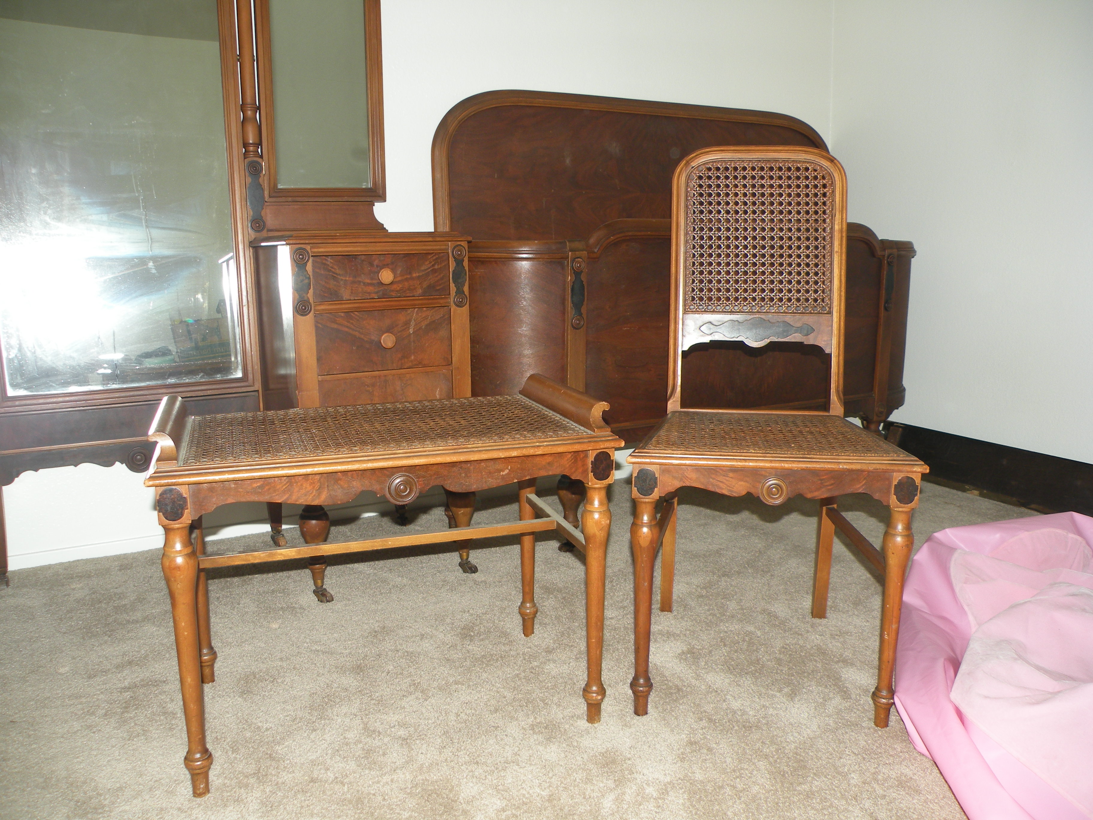 Dresser w/ Mirror, 6 drawers, Vanity w/ 3 mirrors 6 drawers and wicker stool, Full size bed with head board and foot piecs. wicker chair in excelent condition
