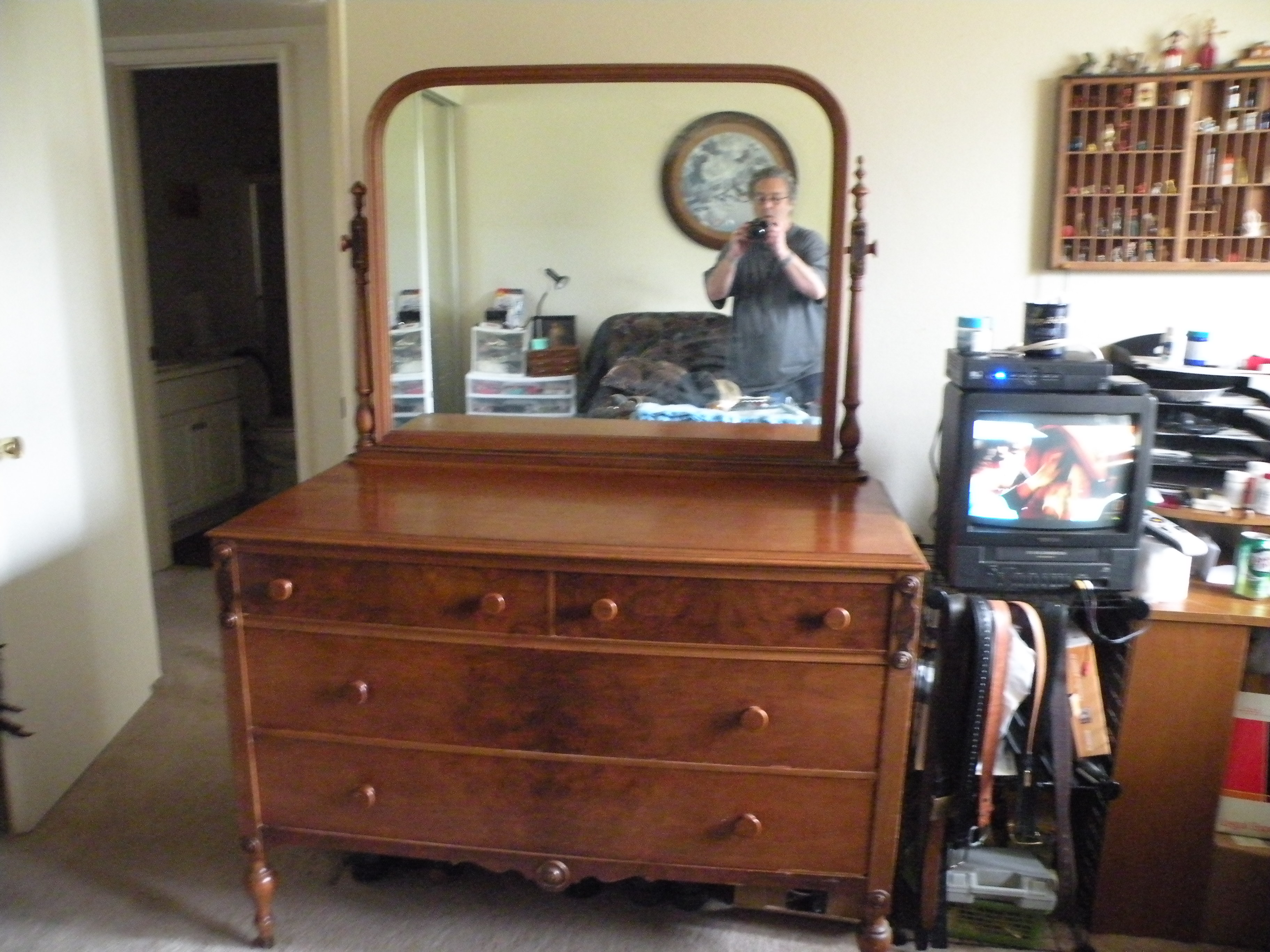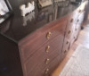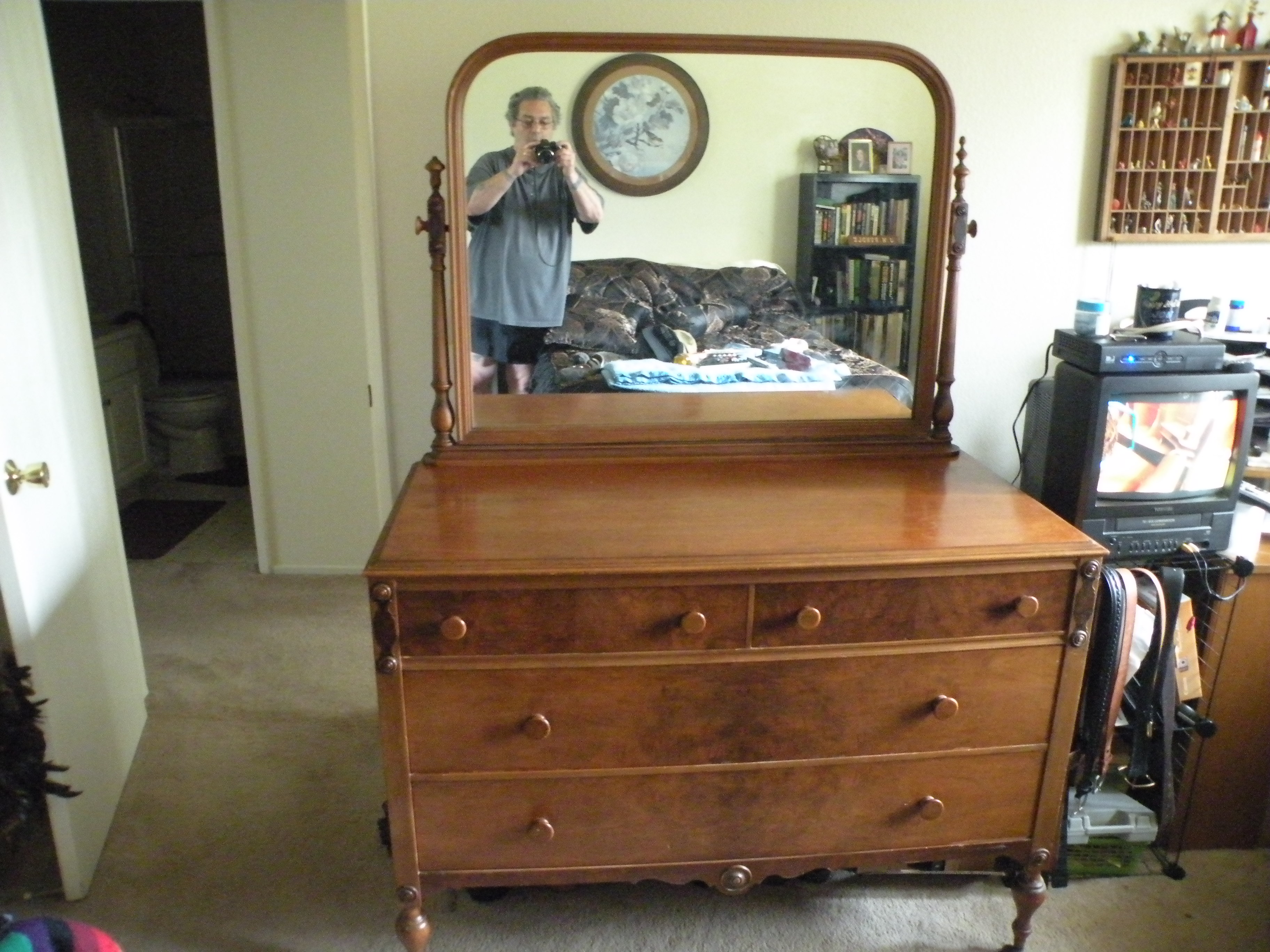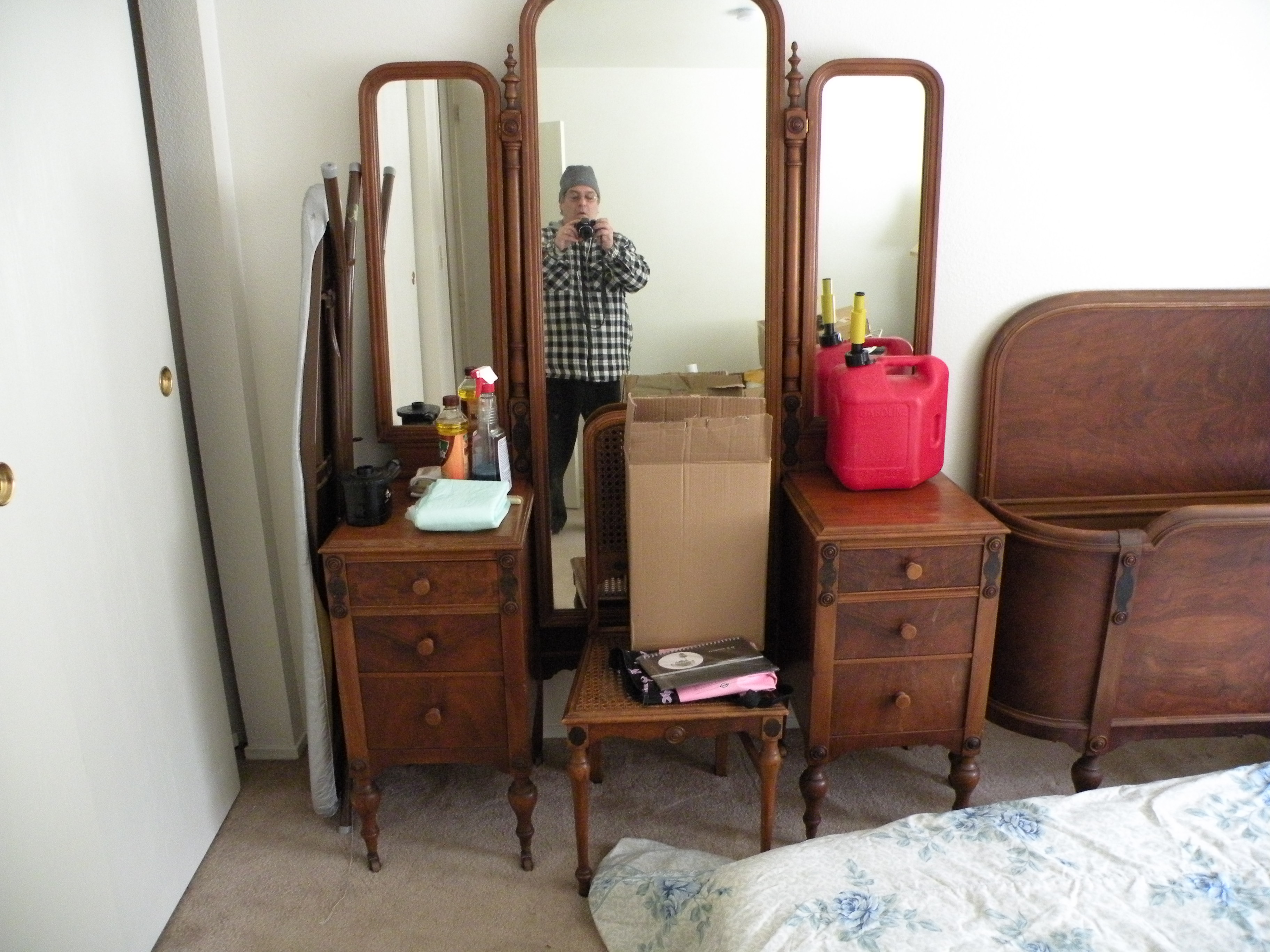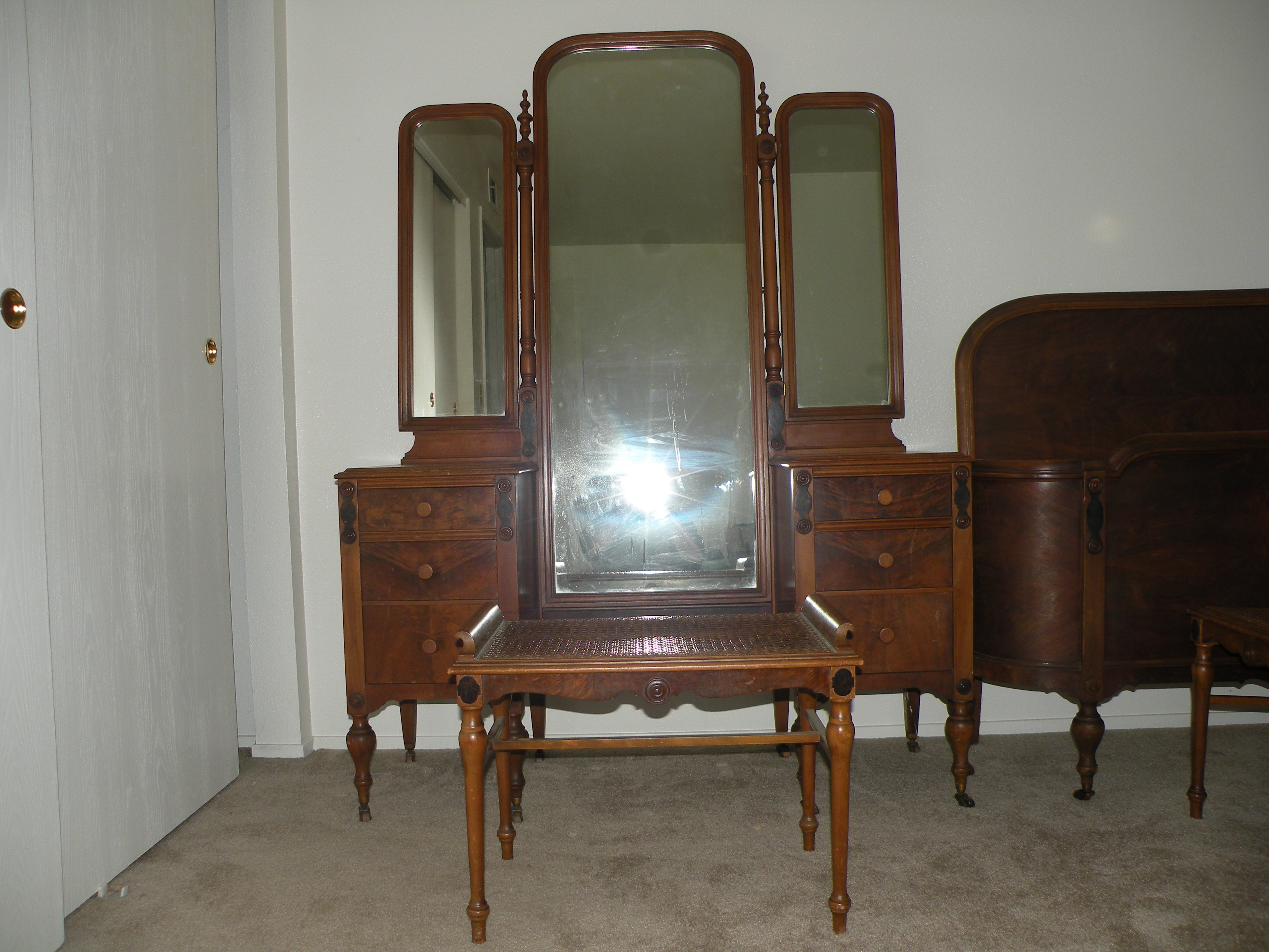 Dresser w/ Mirror, 6 drawers, Vanity w/ 3 mirrors 6 drawers and wicker stool, Full size bed with head board and foot piecs. wicker chair in excelent condition