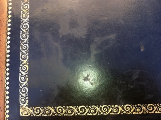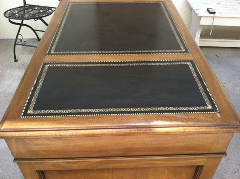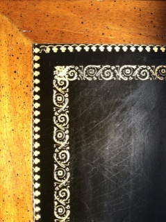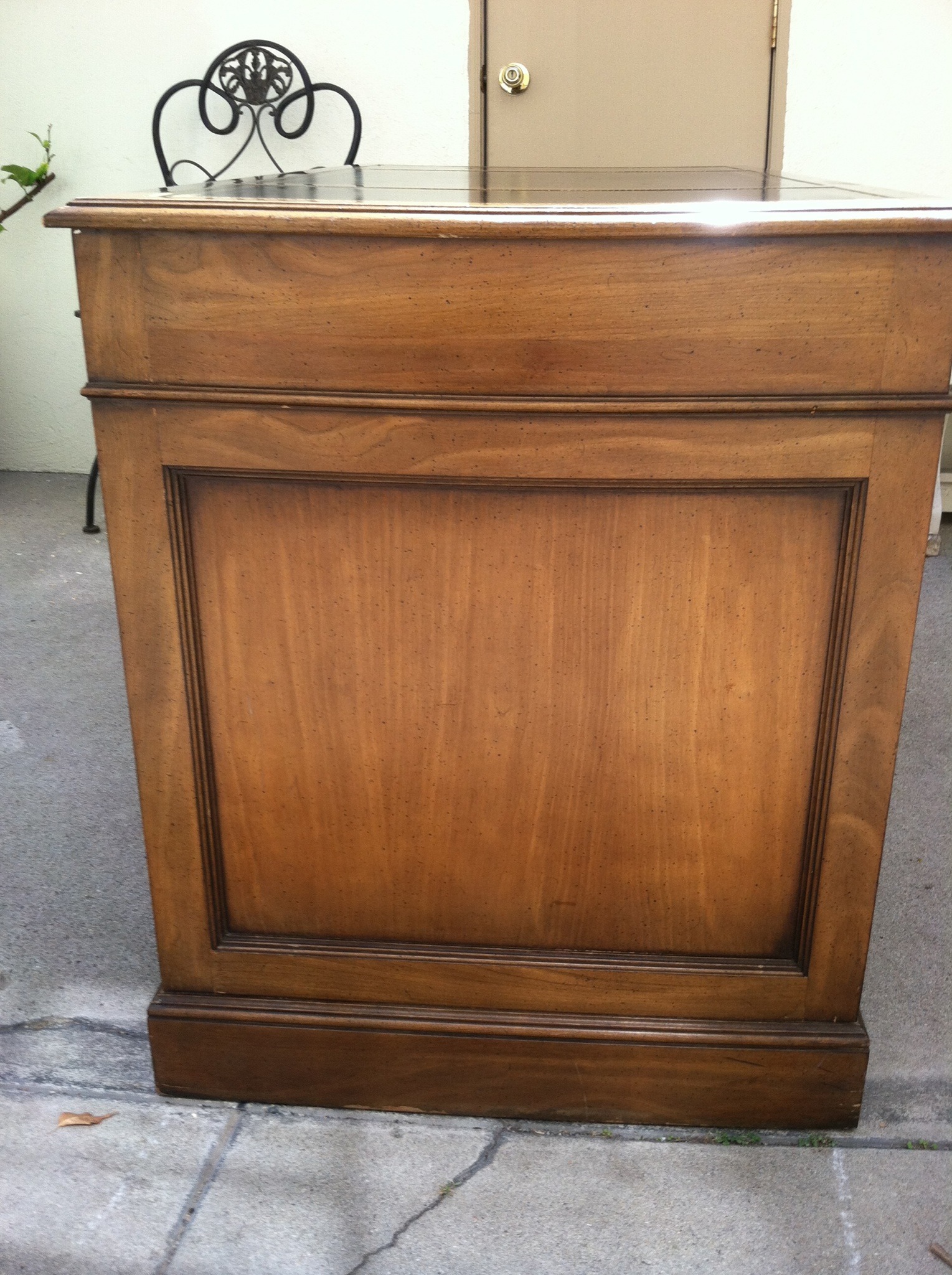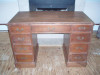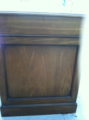 Brown wood with little black speckles in it (don't know what kind of wood it is). Size is 48x24x30. Black leather top is in three sections with two rows of gold trim around the edges-one is next to the wood and it looks like the club in a deck of cards with a string connecting them all...then the other row is bigger and looks like ornate feather wheels connected together. The leather has a slight crackle to it and fine scratch marks. also has three blimishes. Has original hardware, in good condition. Has no legs, wood goes all the way to the floor. The logo is on the inside of the lap drawer and does not have a rectangle boarder around it and the Sligh is in capital block letters then a dash then Lowry is in script with Holland Michigan below the names. It has eight drawers, one of which is a deep file drawer and has dividers in it as well. Overall condition is considered Good.