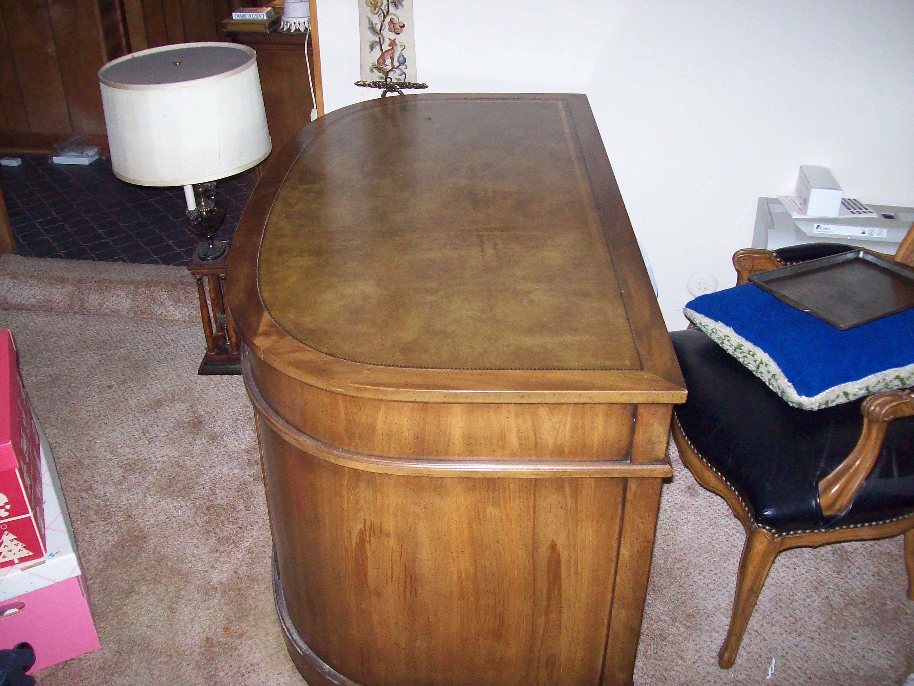 The desk has been lovingly cared for for over 40 years. The top has always had a blotter on it to protect the leather. There is also a leather chair, trash can and letter holder along with a lamp that are included. This desk is for sale!!