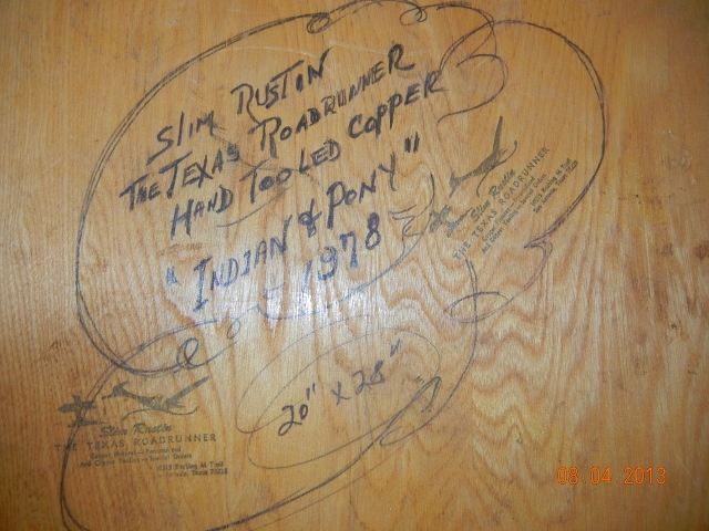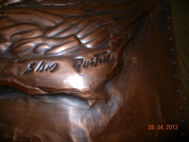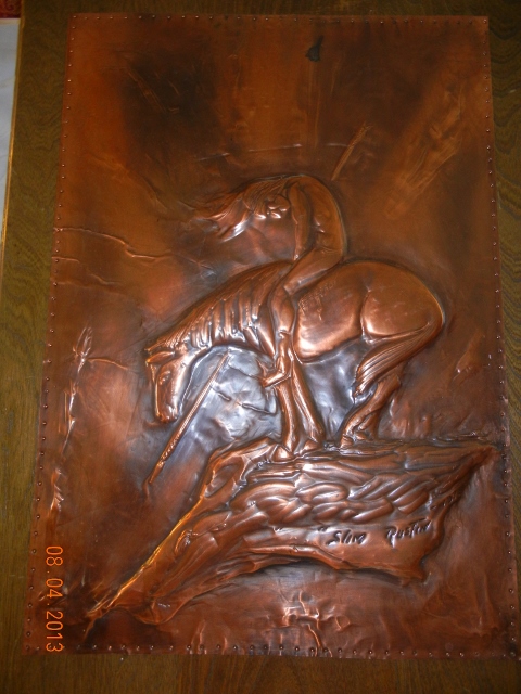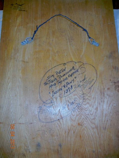 Slim Rustin indian & pony mounted on wood hand tooled copper. Dated 1978. Siged by Slim Rustin on back