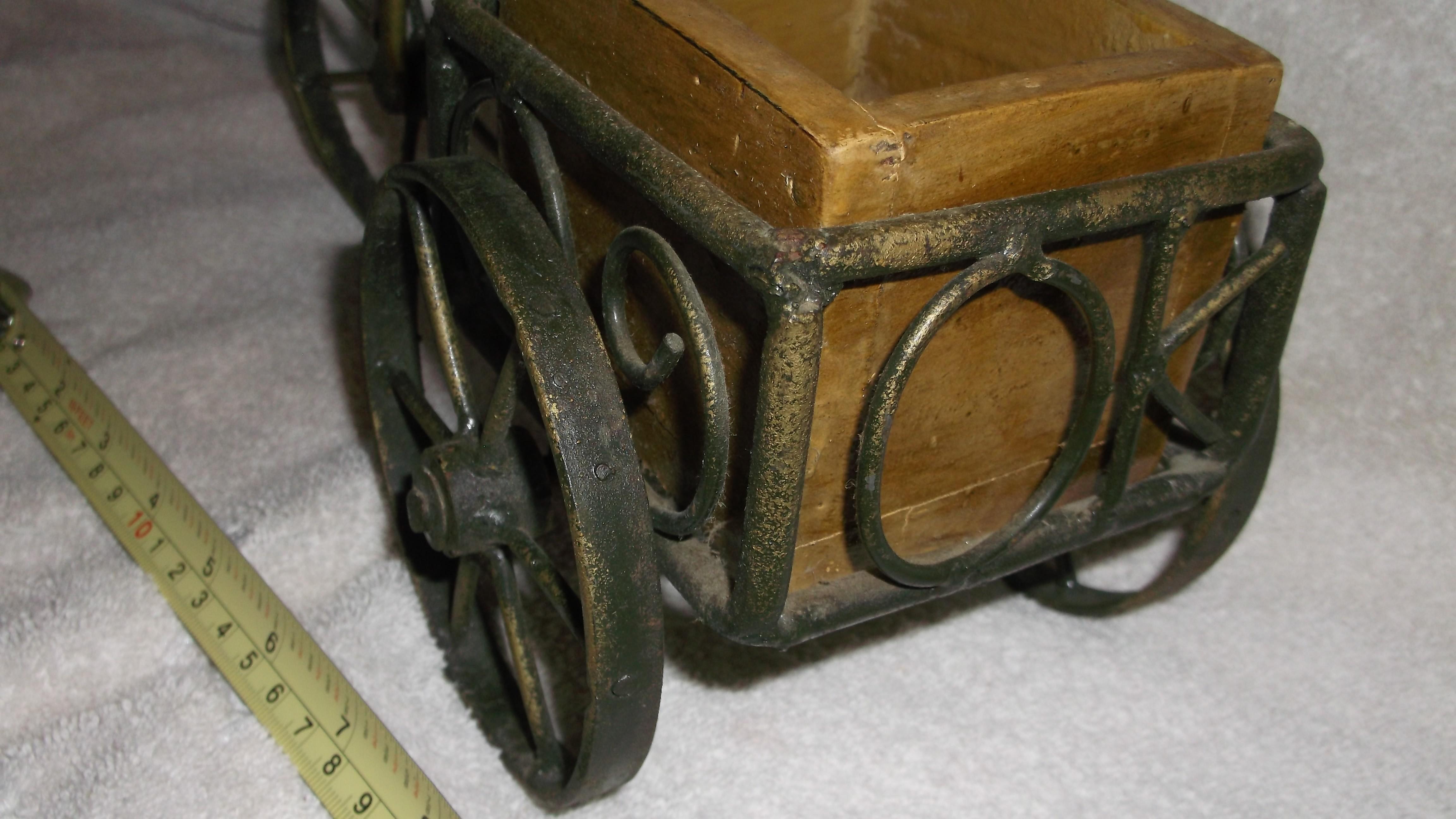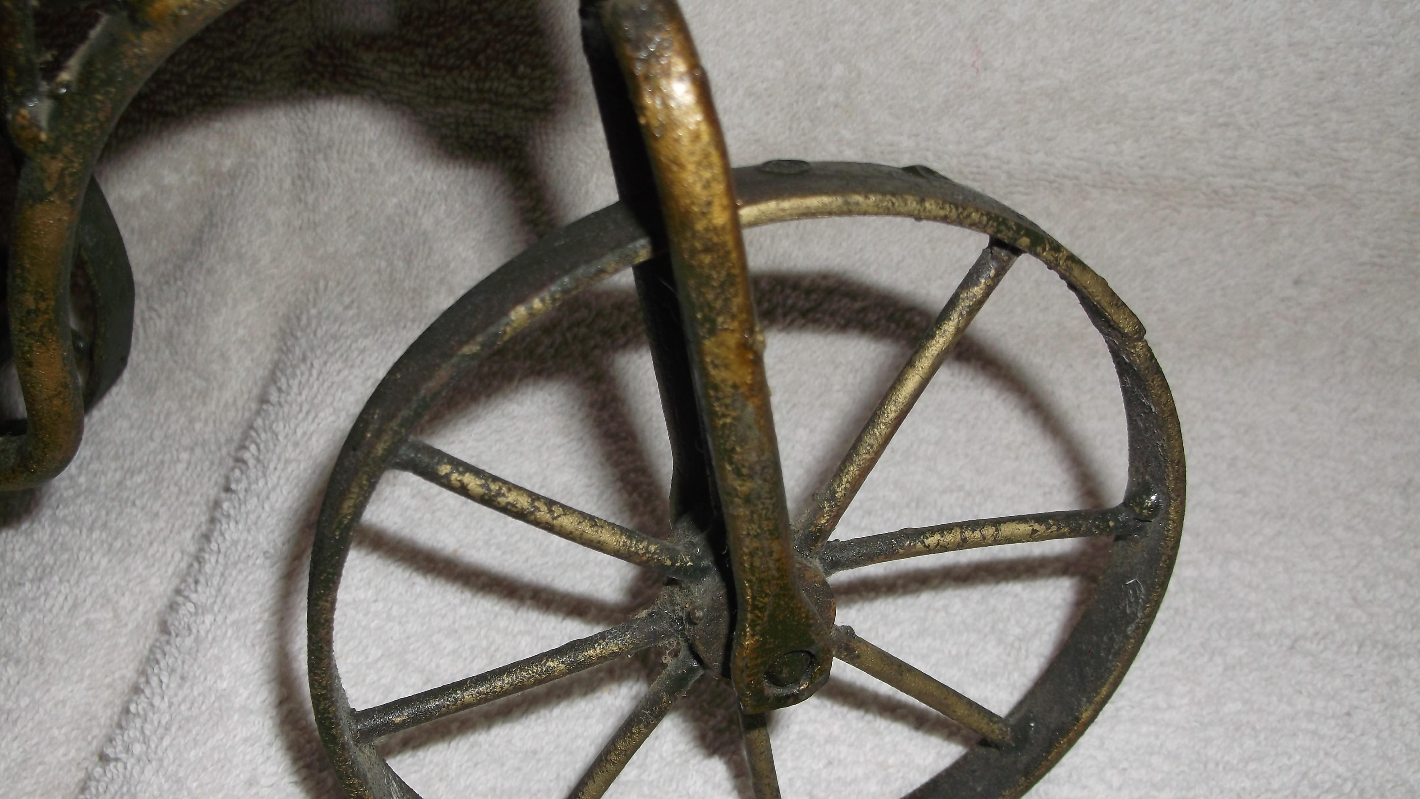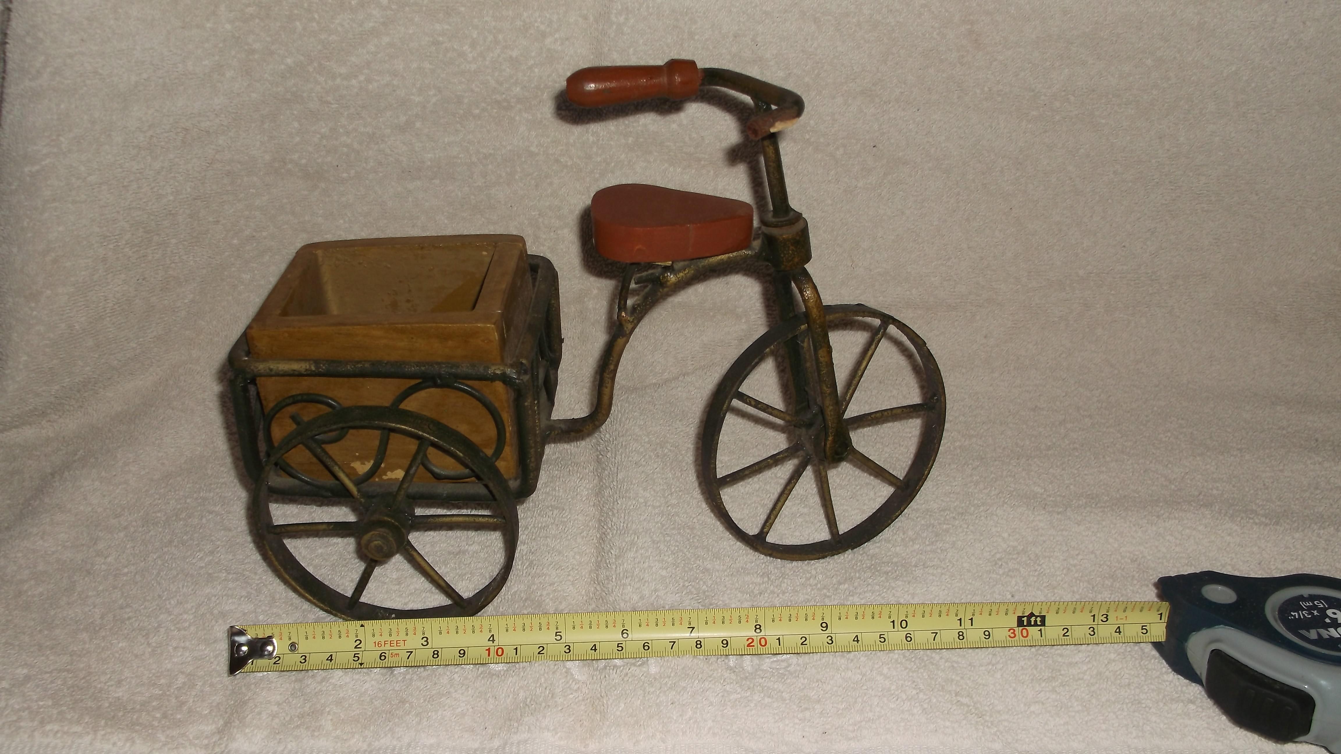 ​This is a table top decoration but can also sit on the floor.  It is a tricycle made of brass but is full of patina due to age.  I don't know how old it is though.  The wheels do have some chips in them and the one wooden handle is missing but is in great condition.  The box is solid wood and attached to the bike.
