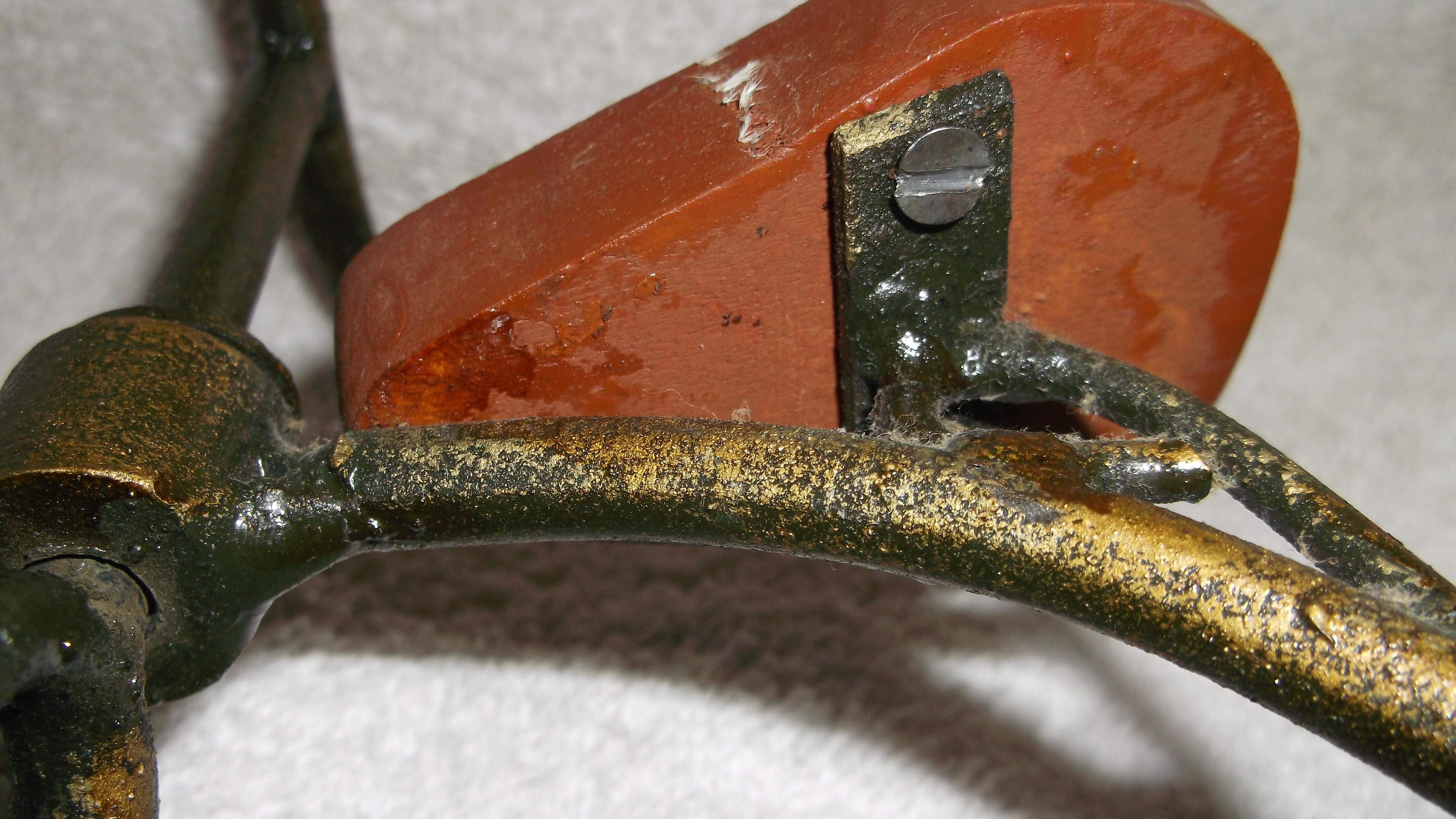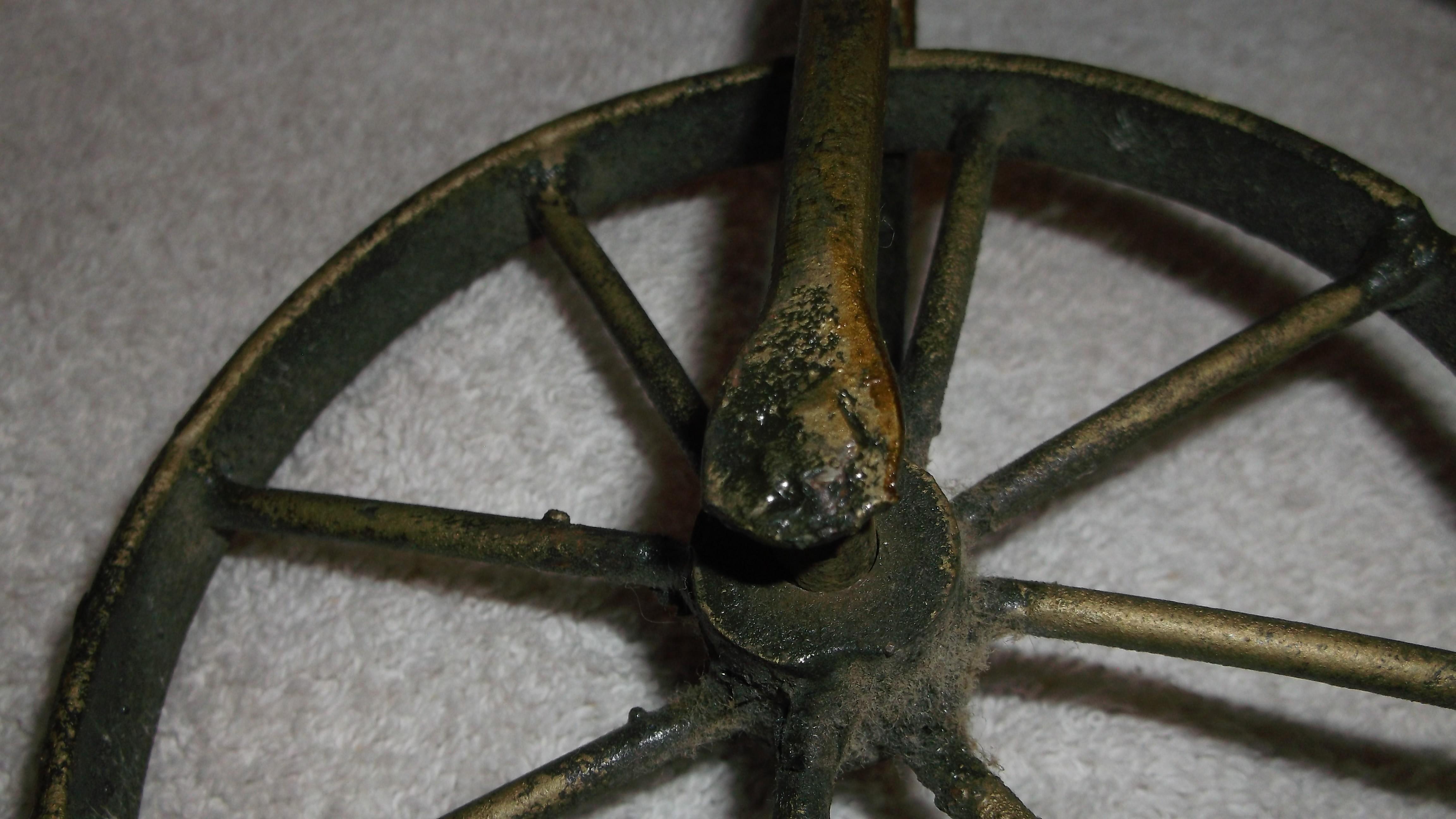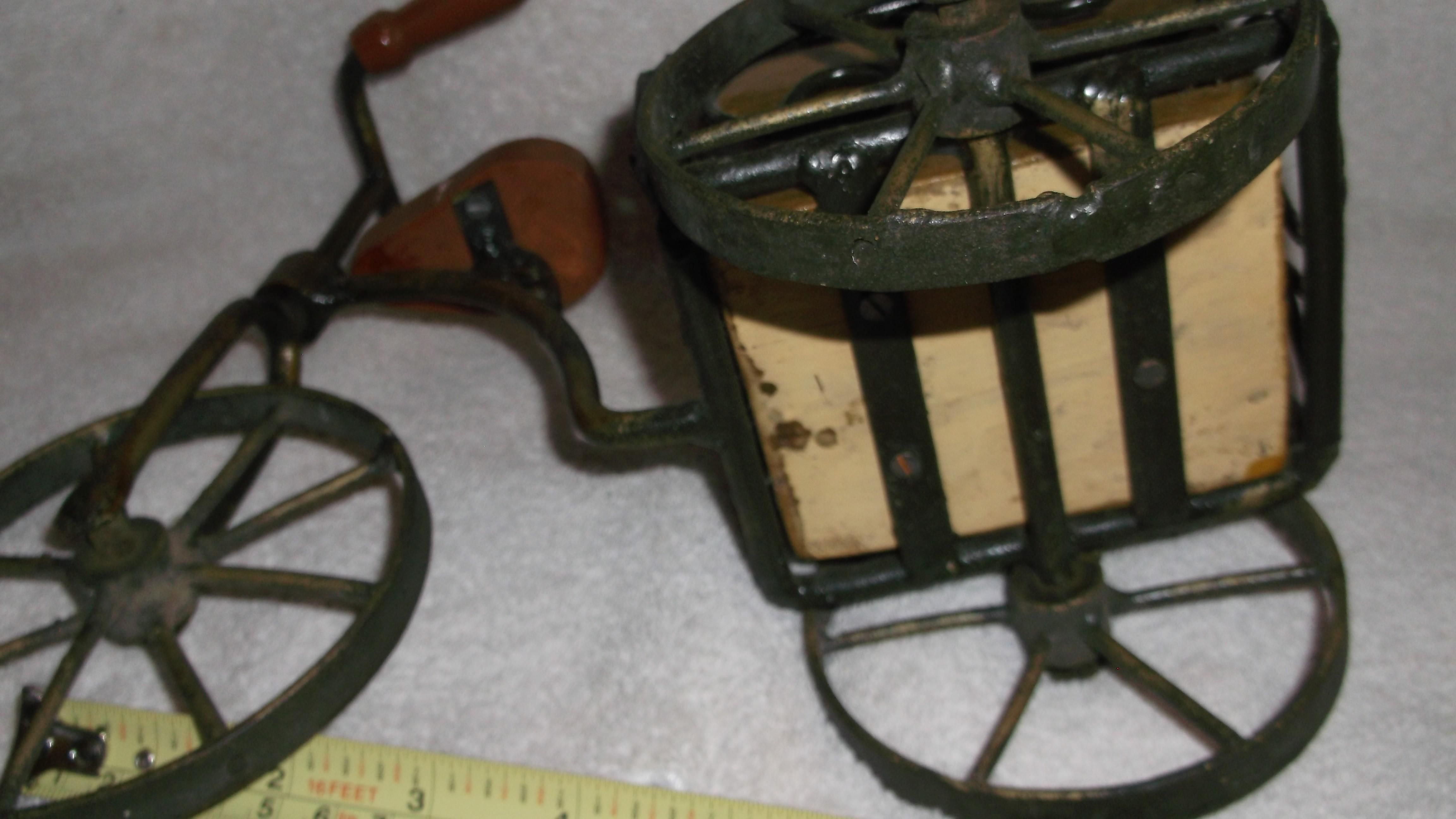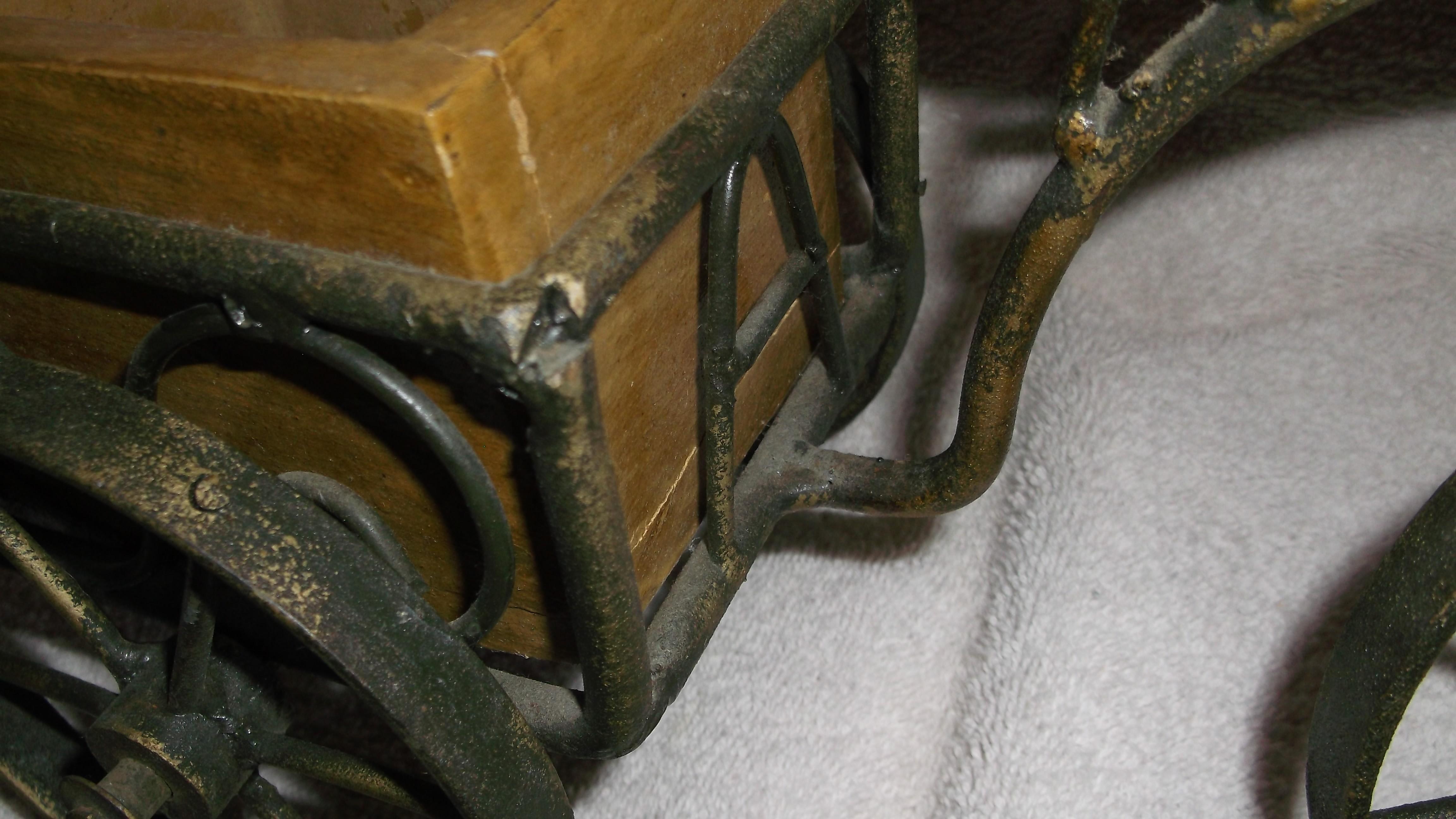 ​This is a table top decoration but can also sit on the floor.  It is a tricycle made of brass but is full of patina due to age.  I don't know how old it is though.  The wheels do have some chips in them and the one wooden handle is missing but is in great condition.  The box is solid wood and attached to the bike.