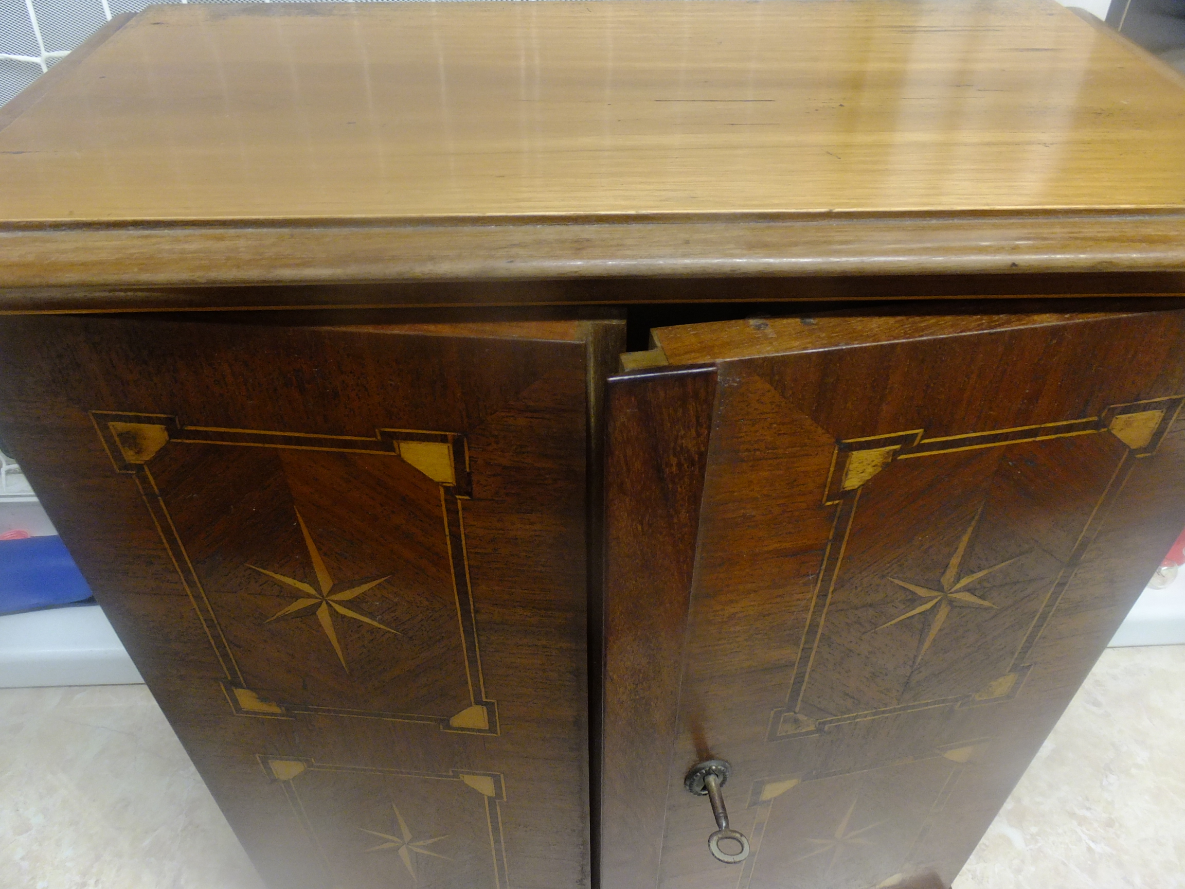 This is a very old, small (50x45x20 cm) beautiful cabinet from grandparents, maybe used from storing medicine bottles or something similar in size. It has two lockable doors and two shelves inside. I would like to know the age of it, and if it has any value.
