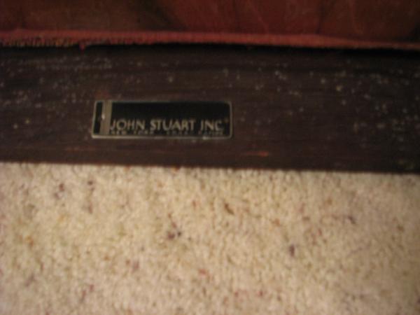 I believe the red covering is origional. It is tacked on not stapled or glued. The seller stated she thought the item was over 100 yrs. old. I noticed on the web that there was a John Stuart that worked for the Stickley Furn, Co. I wonder if this could be the same person.