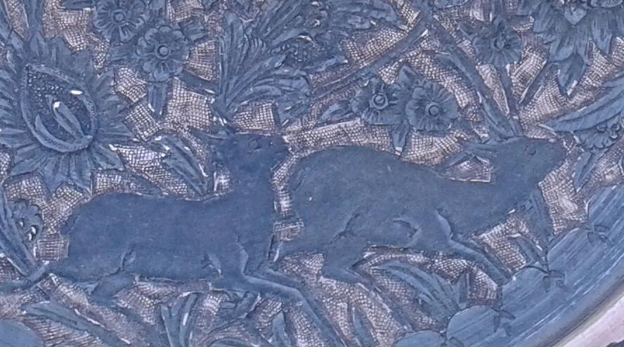 Antique Persian Tray - purchased by my father in the 1960's while on a trip to Iran. This tray is similar to another one I have listed on this site. This particular tray is 11 inches in diameter and is make of silver and copper. The tray depicts various animals. The edges have cutouts. I don't know how old it is, but appears similar to those listed here and on other sites as being from the 1800s or before.