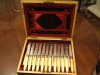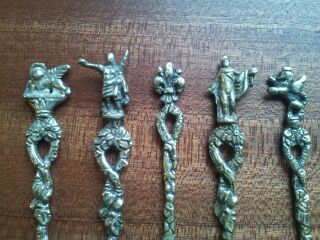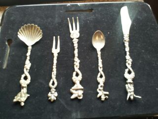 These appear to be silver but I am no expert. They are very ornately embossed with a twisted handle and beautiful little decorative tops.