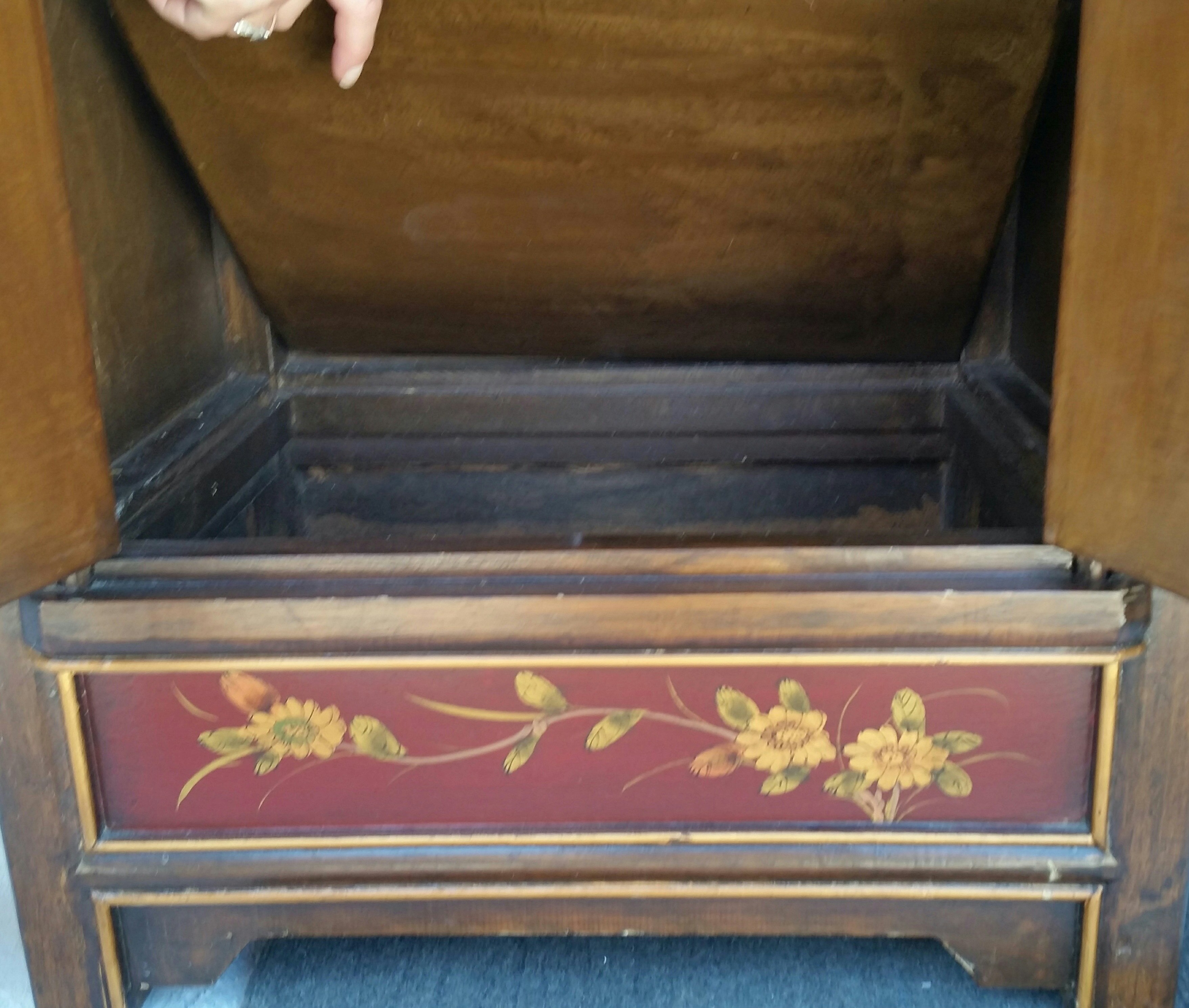 This is a small oriental chest approximately 28 inches high, 22 wide and 18 deep. It appears to be solid wood with metal hardware, inside is a hidden campatment. It has several beutiful paintings on the top and front, with a red background and gold trim.