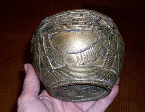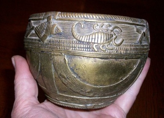 I inherited this small bowl around 40 years ago; I have no idea if it is older than that or not. It's 3 inches tall, and approximately 4 1/2" in diameter, and I believe it is made of bronze. There are 4 fish and 1 scorpion along the upper outside rim, as well as ribbing in patterns all over it. The bottom has circular ribbing along the edge, and a ribbed cross in the center. The inside of the bowl does not have any decoration.It looks like folk art of some type — African? — as it's quite rough and the figures are stylized. I've always been curious about it!