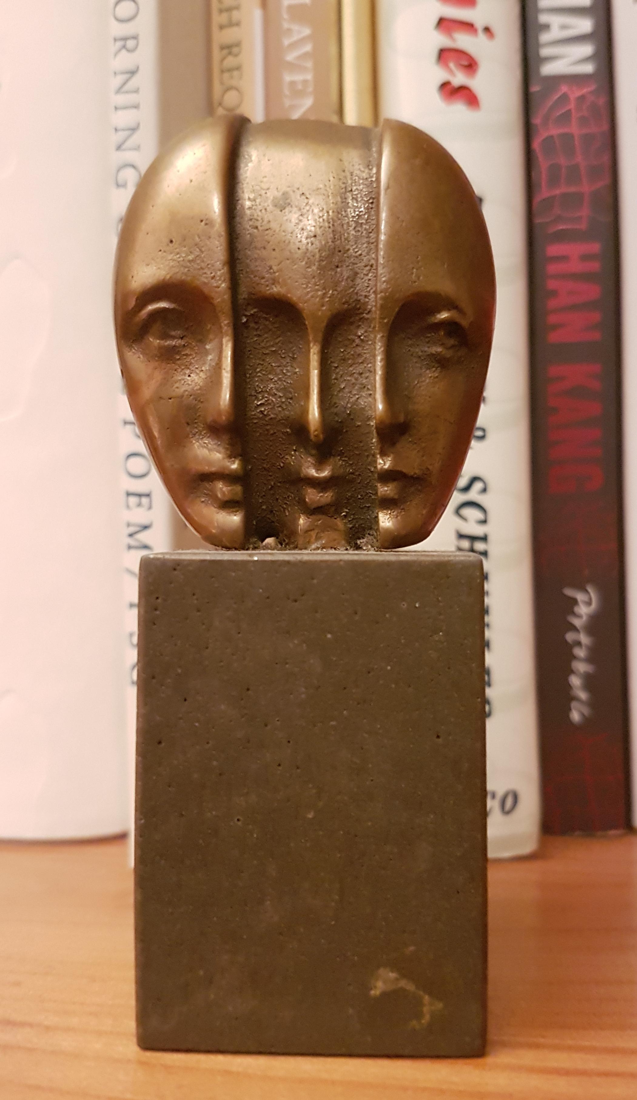 This small sculpture was given to me about 10 years ago in London. Its measurements are: 9×3 cm (3.5×1.2 inches). I believe it is made of bronze, yet don't know much more about it, unfortunately. Could it be a kind of award? It might have something to do with poetry or translation.