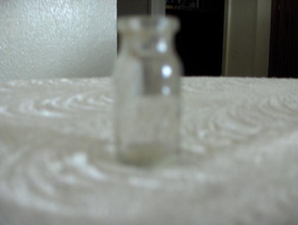 Small clear round glass bottle,on the bottom of the bottle, on the edge centered is the number 17 and on the adjacent edge is a symbol, the bottom of the bottle is 3/4" in diameter and the bottle is 1 3/4" high.