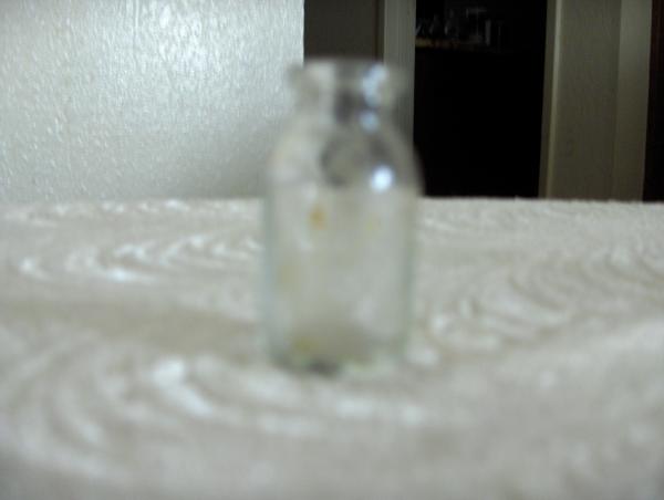 Small clear round glass bottle, in the center of the bottom of the bottle there is a number 7, and around it says TCW CO USA, the bottom of the bottle is 1" in diameter, and the bottle is 2" high.