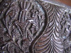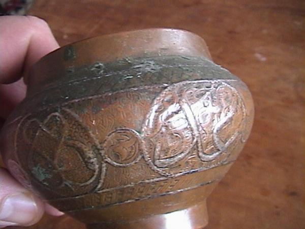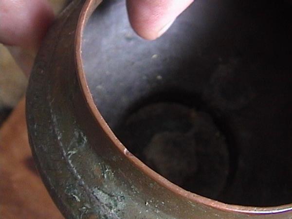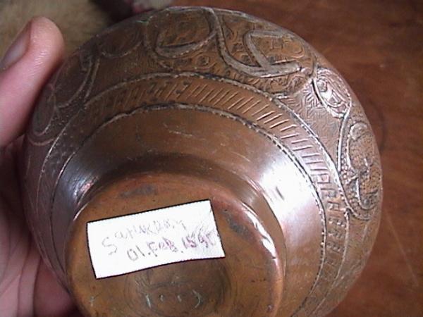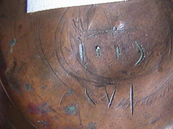 Soft red copper with silver inlaid lettering. Similar to the modern ones, made in brass.