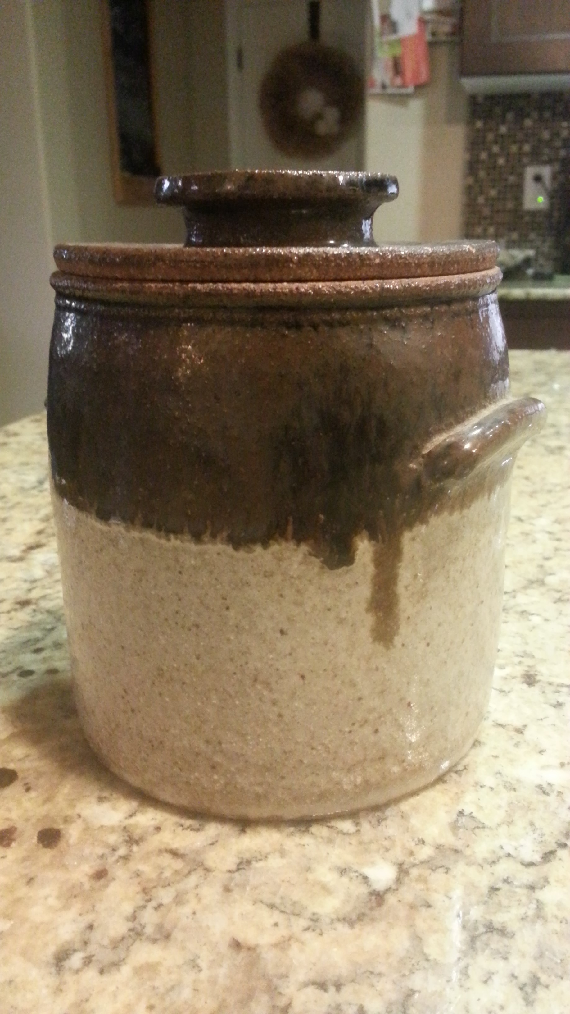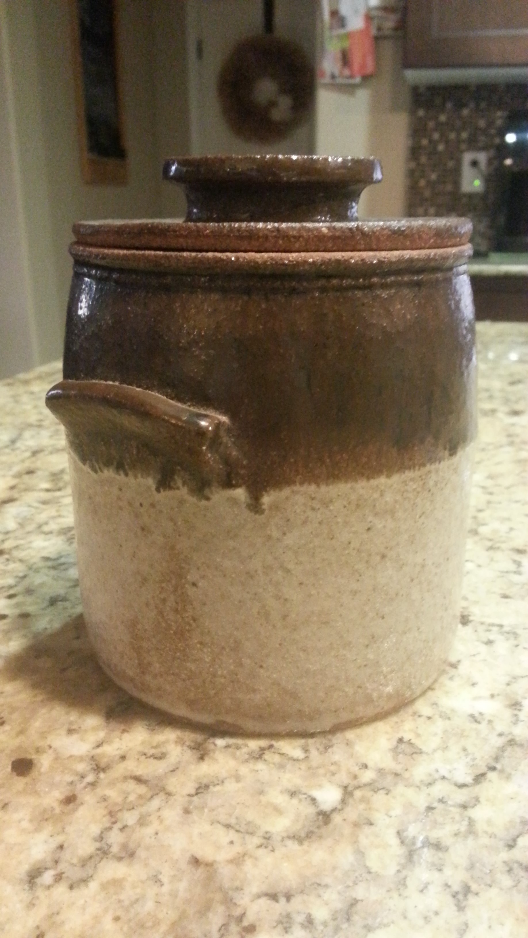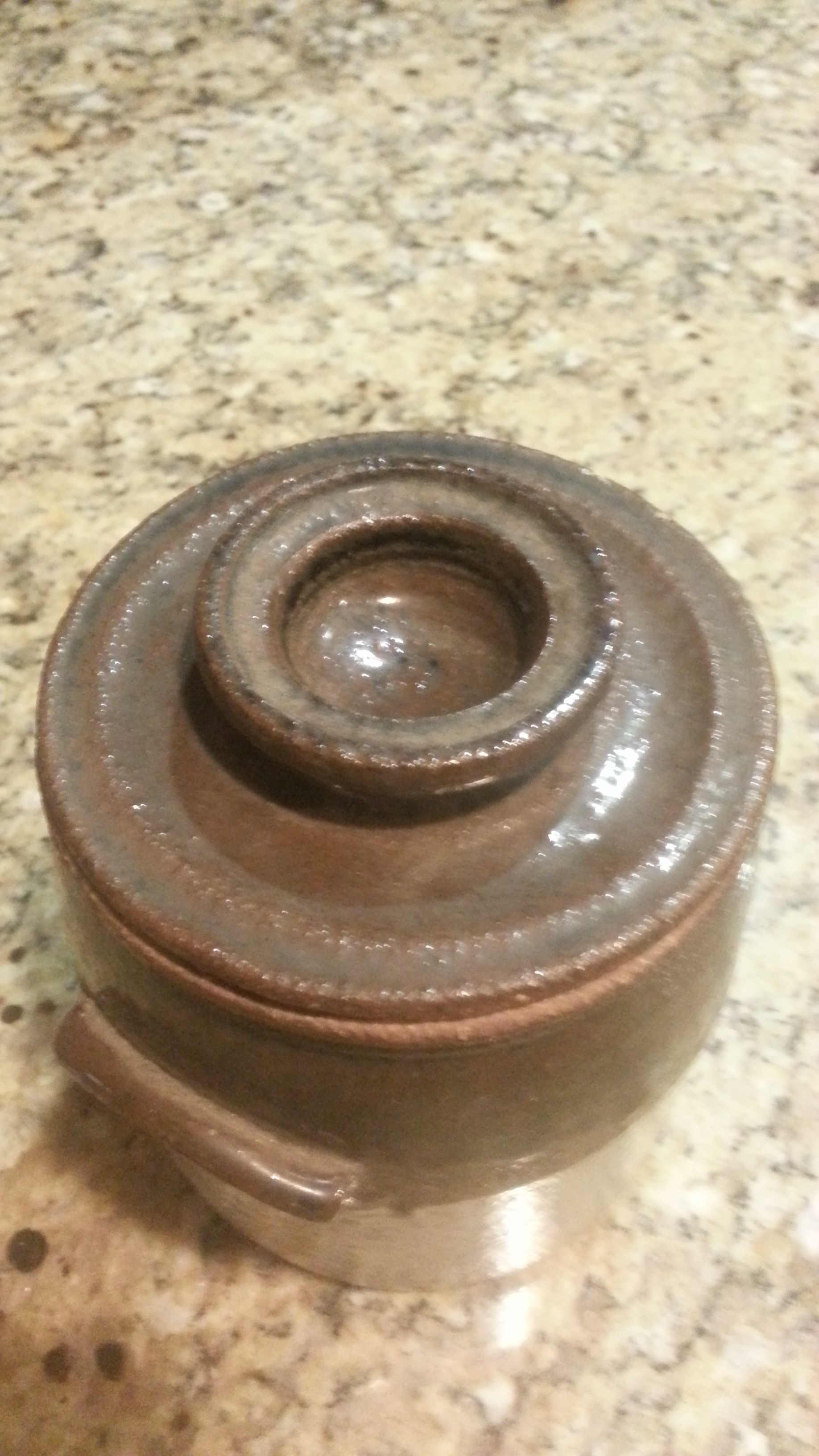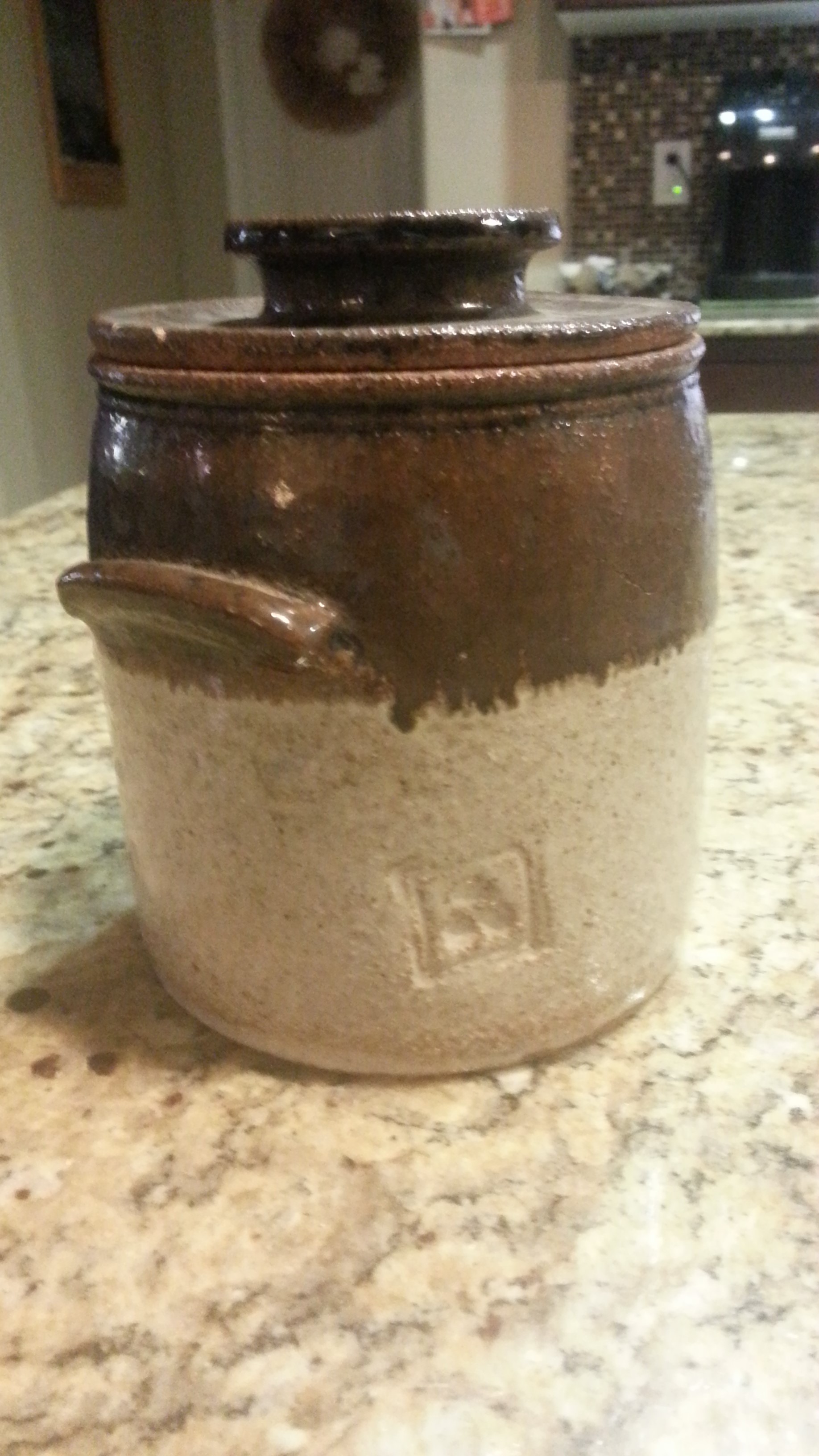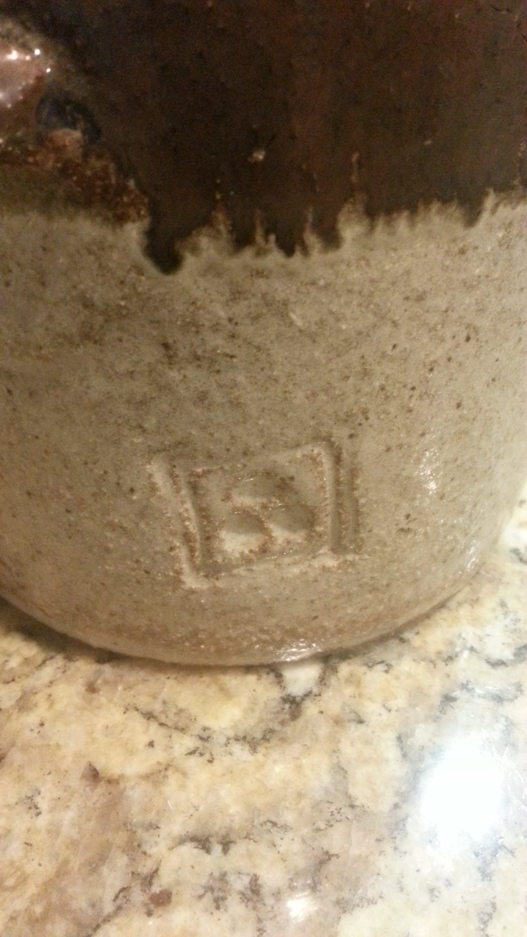 This is a small crock and I don't know if it is old or new. I can't locate the origin of the mark stamped into the side of it.